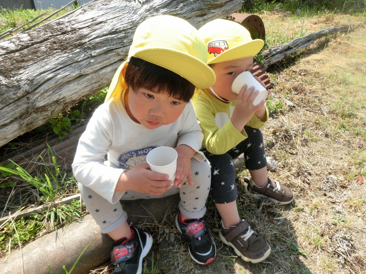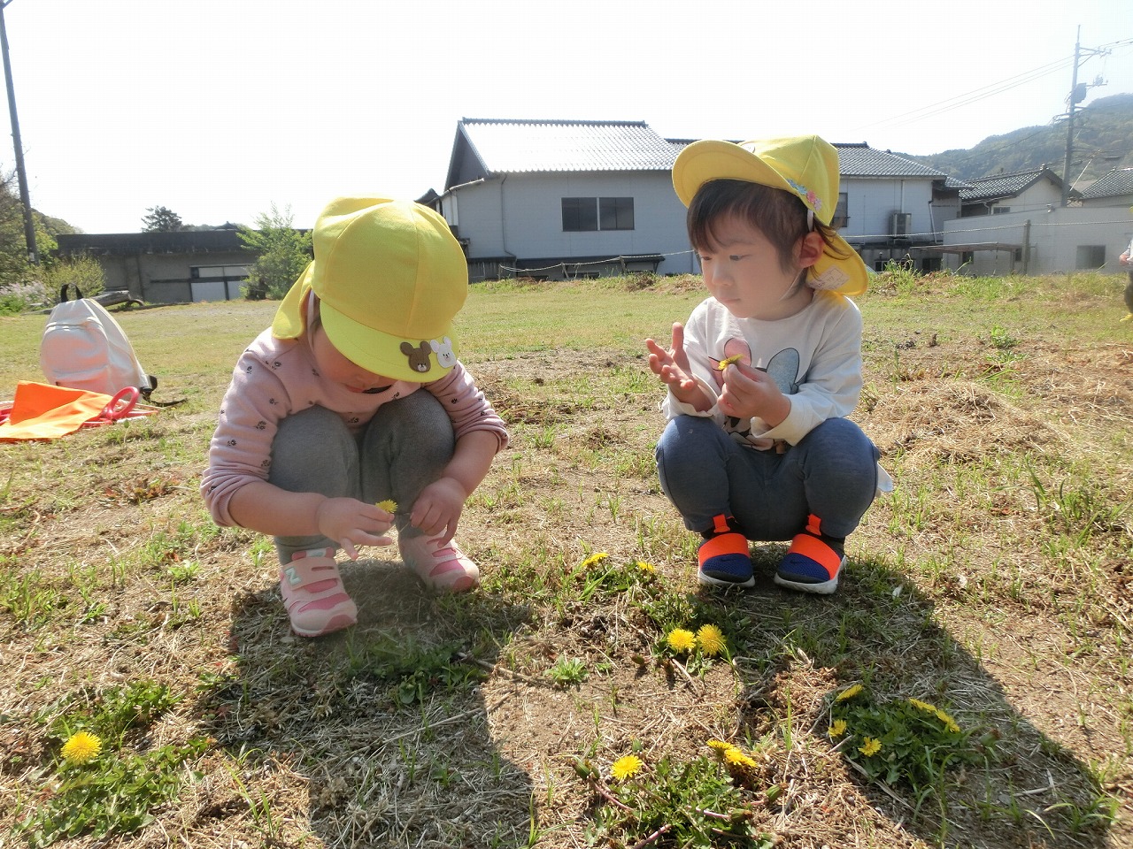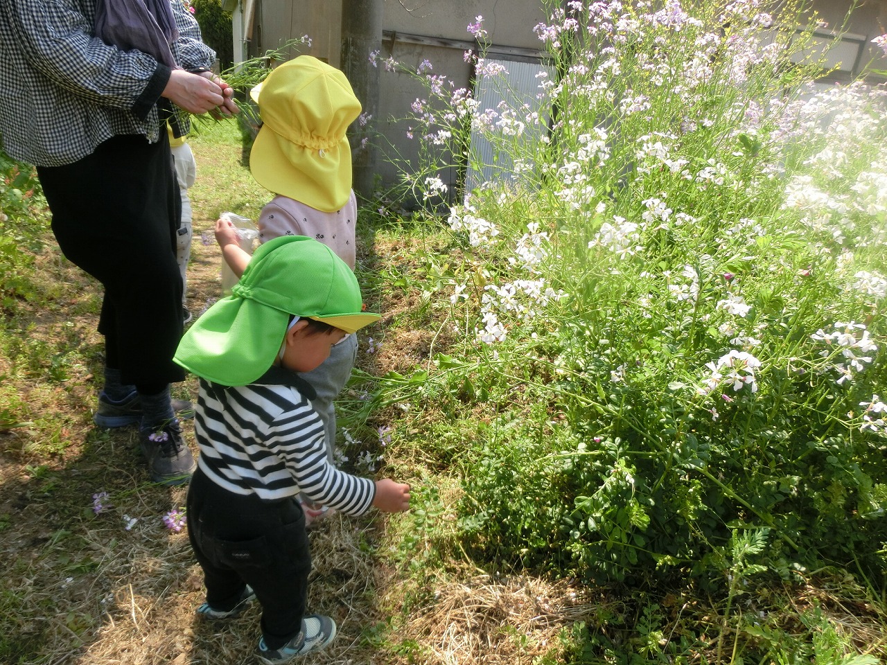 草花を見つけたり、バスに手を振ったり、地域の方やバスの運転手さんに挨拶をしたりととても楽しいお散歩になりました。