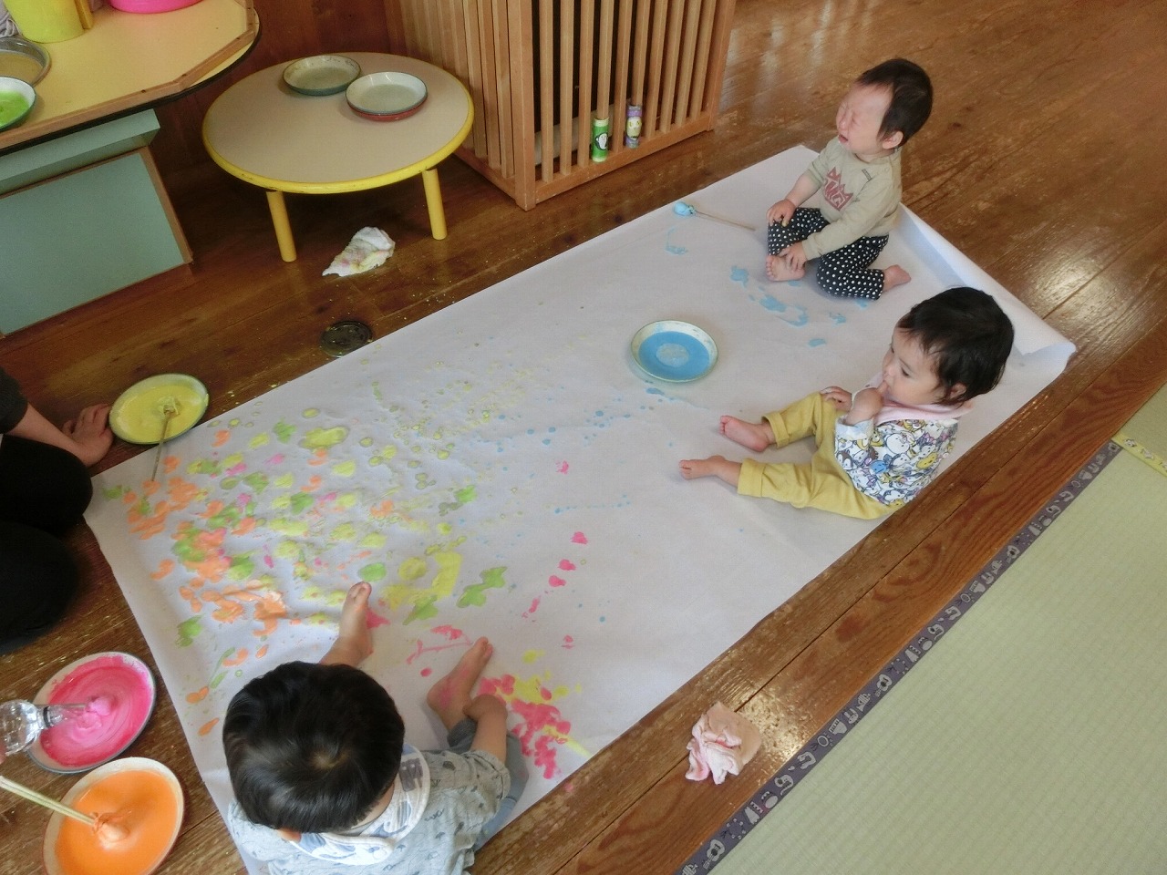 絵の具に初挑戦の子どもも多く、初めは手に着くことを嫌がったり、涙が出ることがあったりしました。遊んでいくうちに楽しさや面白さが伝わったようで、今では準備する保育者のそばに来て「あー!」とやりたい気持ちをアピールする子ども達です。