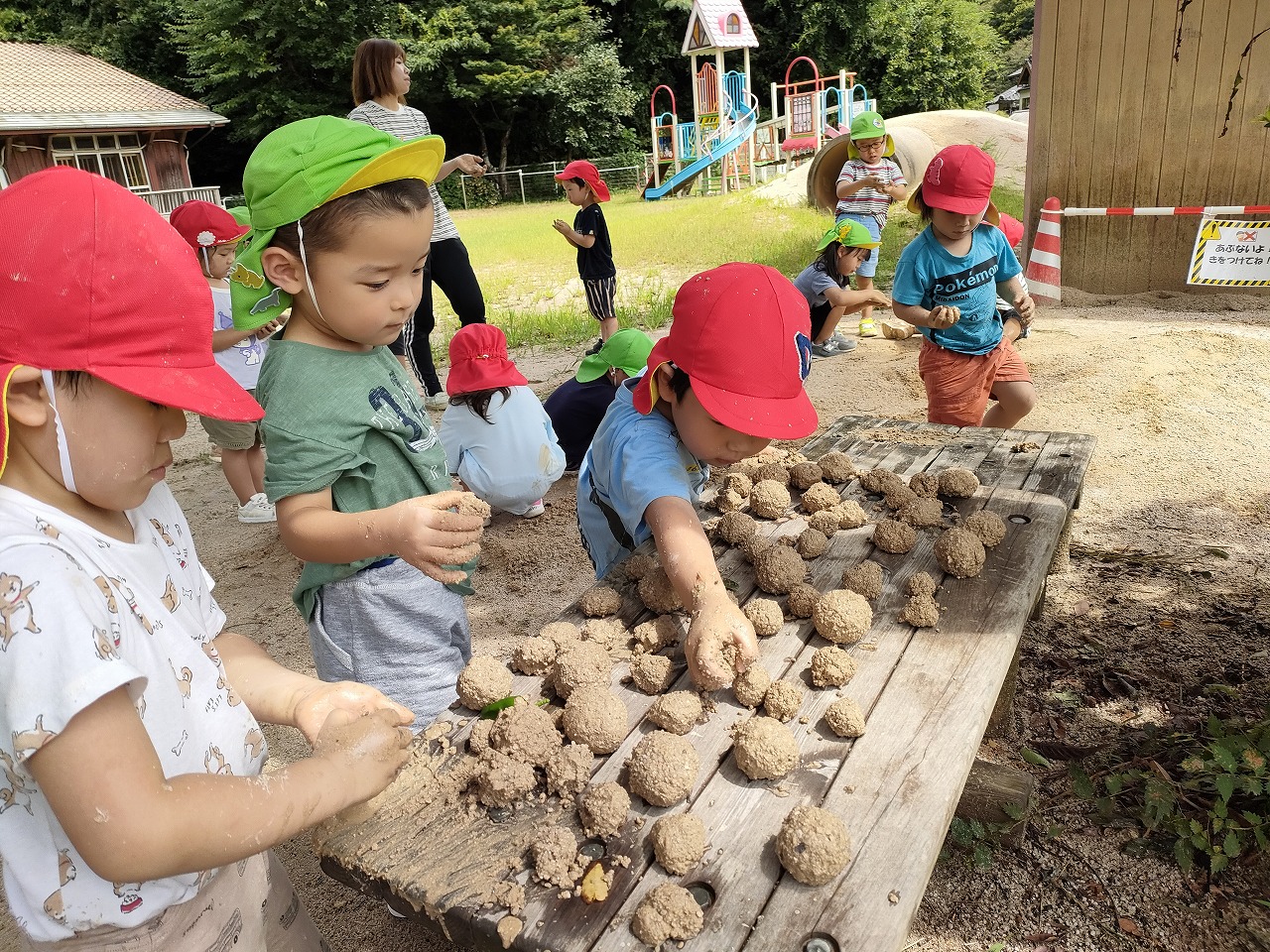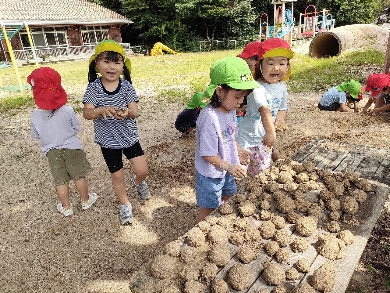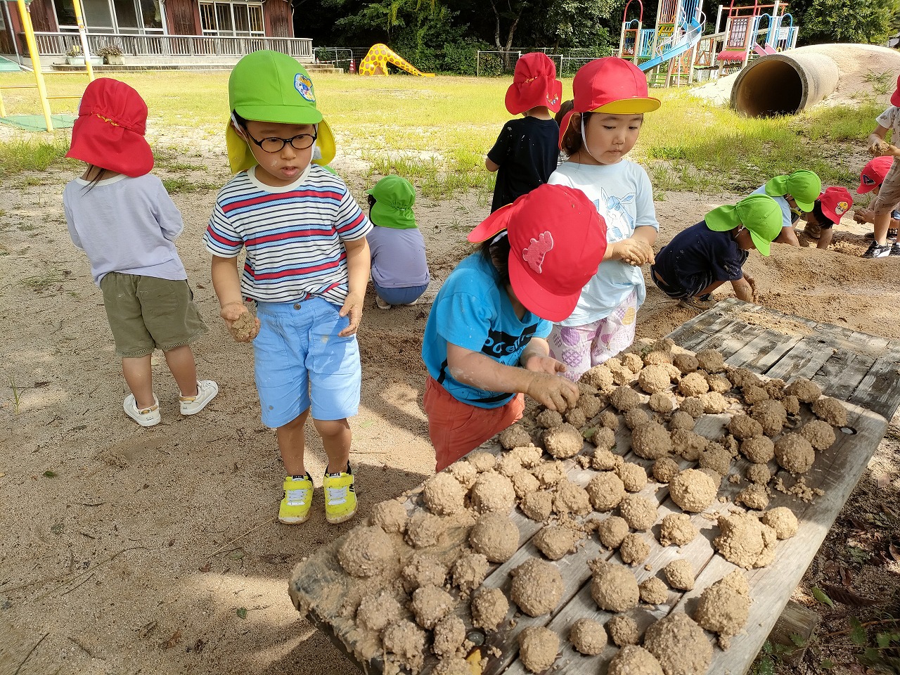 雨上がりの庭に出るたび、みんなでだんご作りを楽しんでいます。