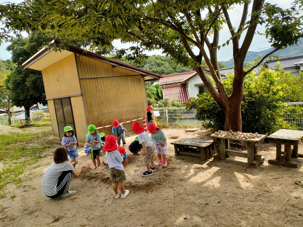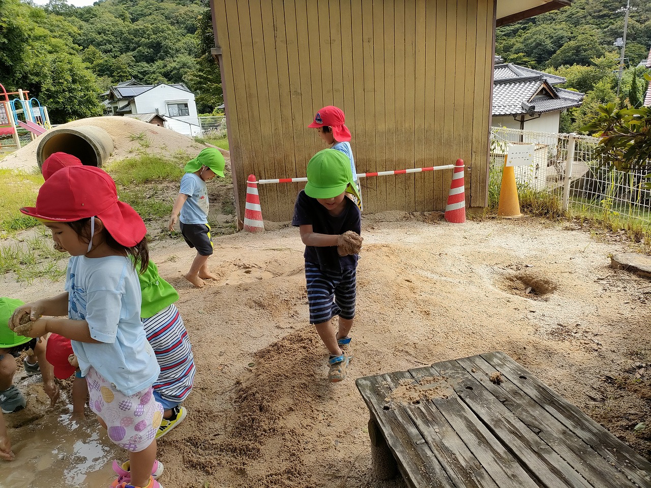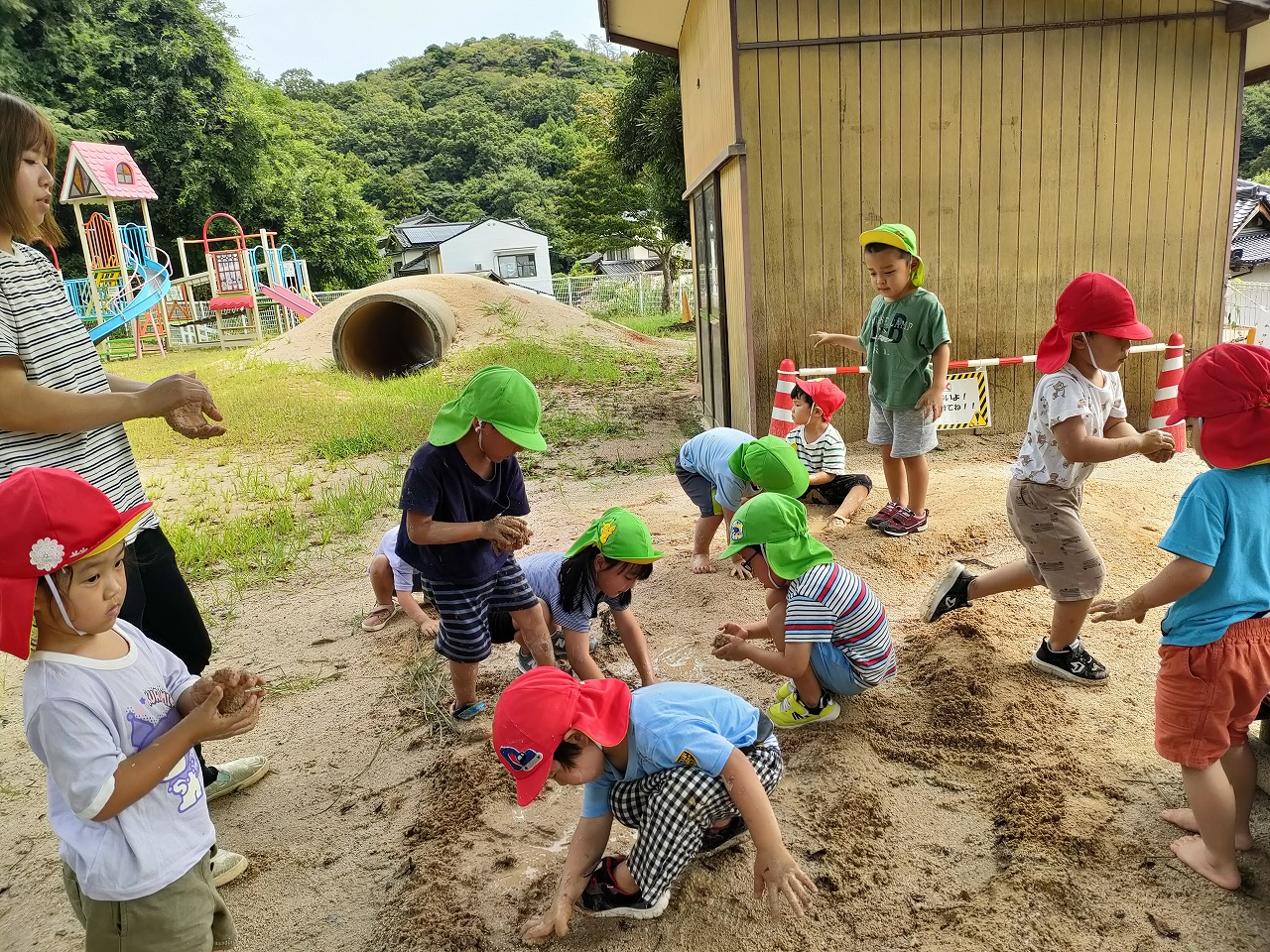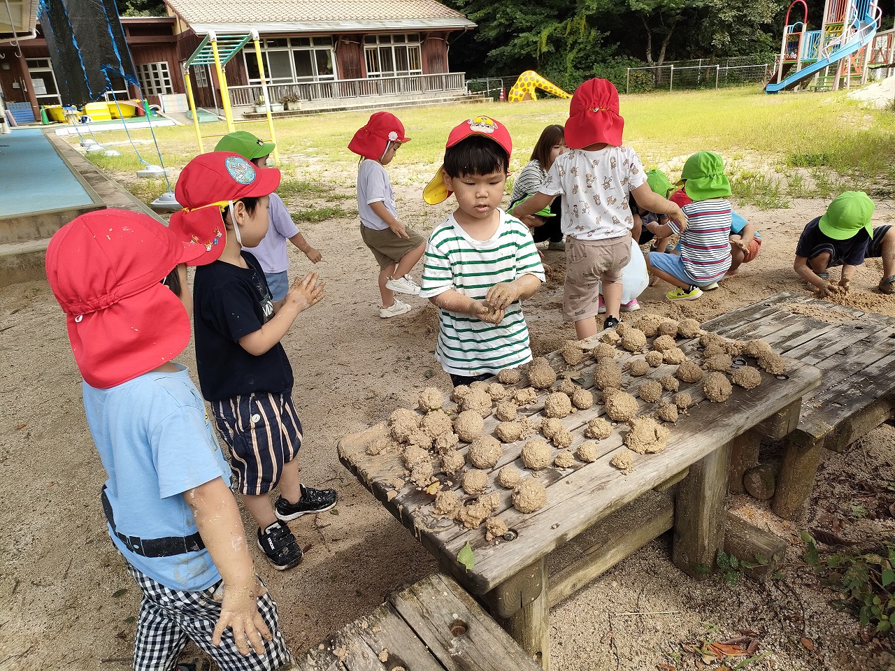 雨上がりの庭に出るたび、みんなでだんご作りを楽しんでいます。