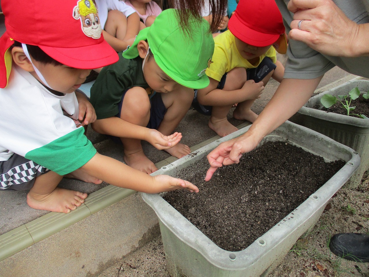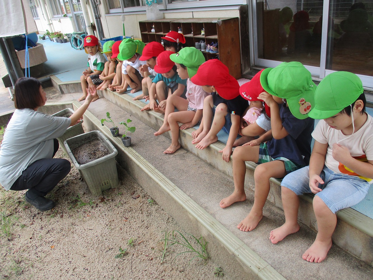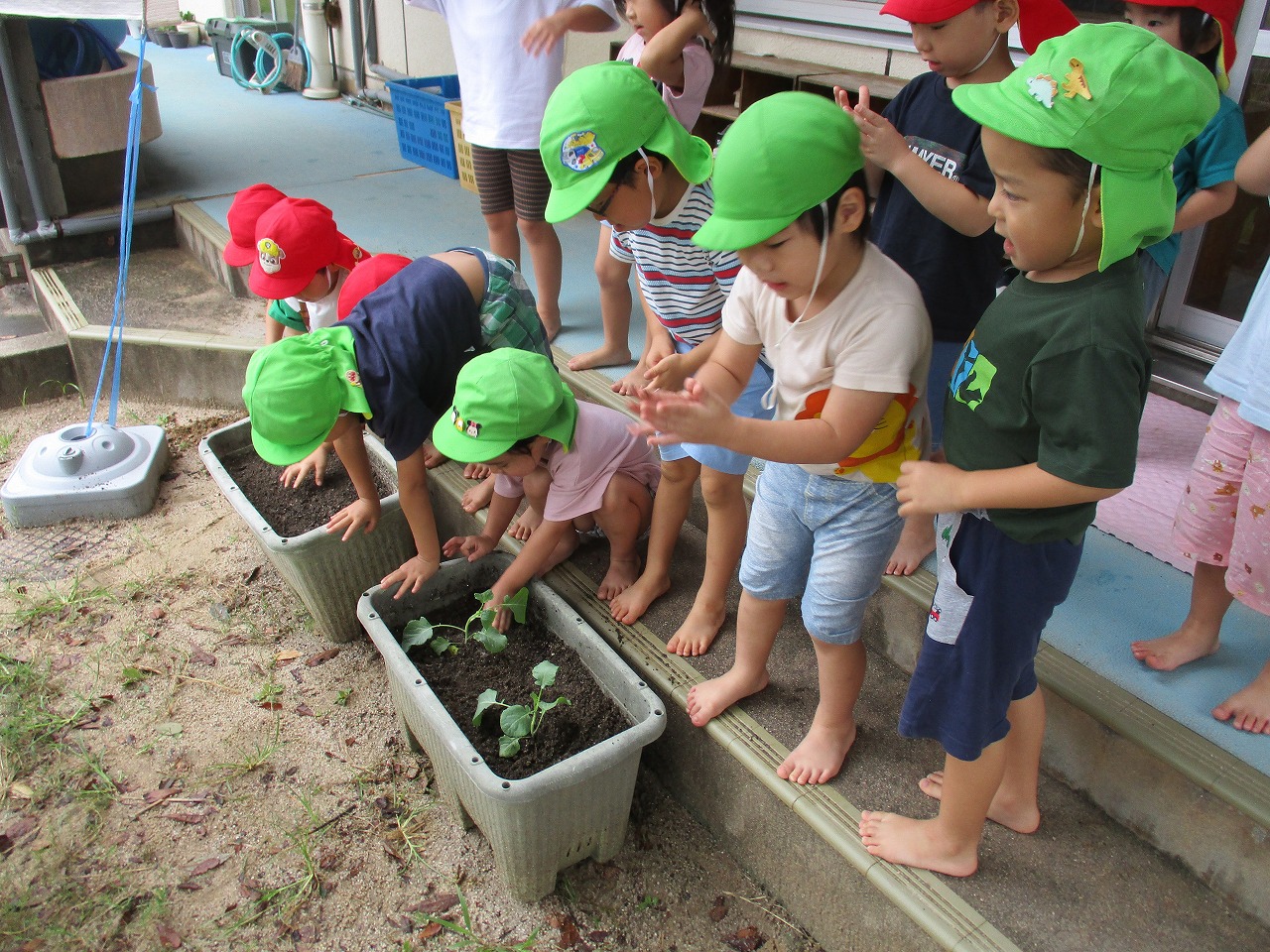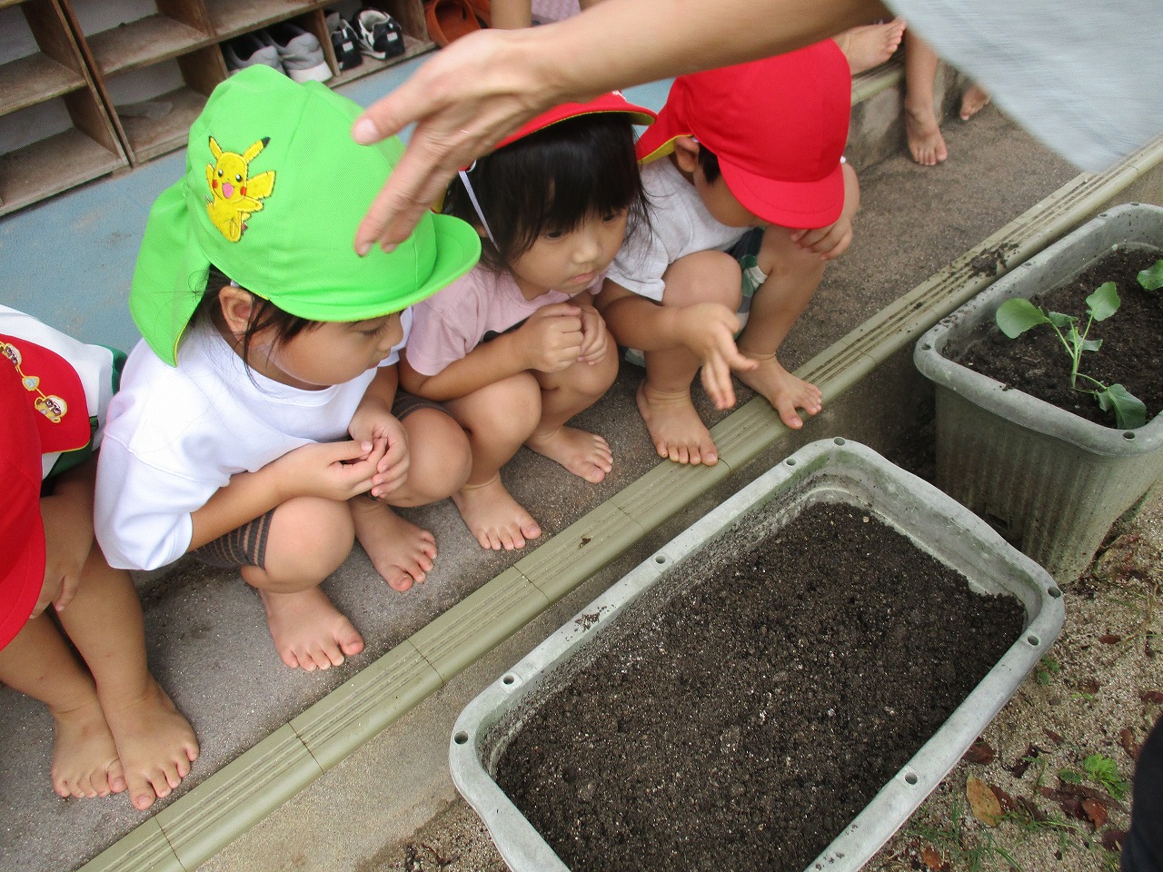 春から夏にかけては、ピーマン・きゅうり・オクラを愛情込めて育て、毎日水やりも行い、たくさん収穫し、クッキングも行いました。にんじんの種類はメロディーという種類だったのできりん組の子ども達は、「メロディーちゃーん!」と呼びかけています。可愛い声がきりん組前のテラスに響いていましたよ。子ども達からは、「ブロッコリーやにんじんをたくさん収穫できるといいなぁ~」「どうやって食べようかな」と早くも期待が膨らんでいます!