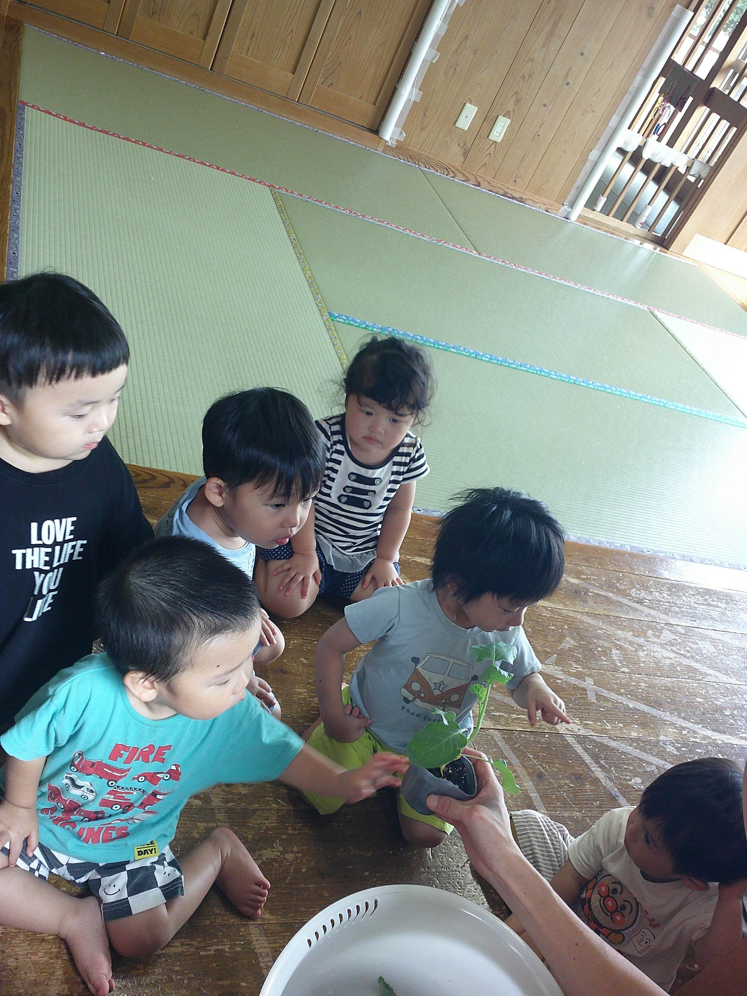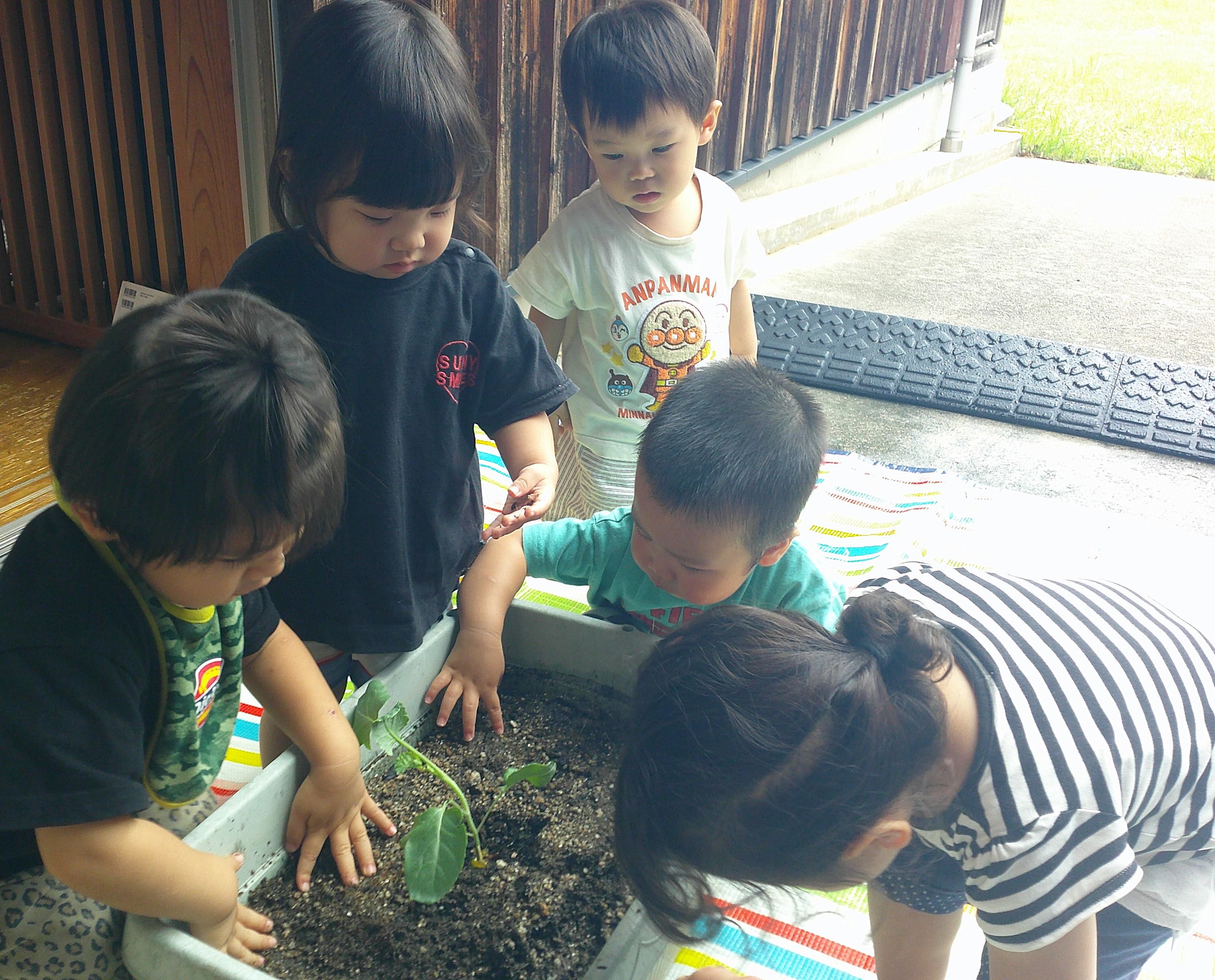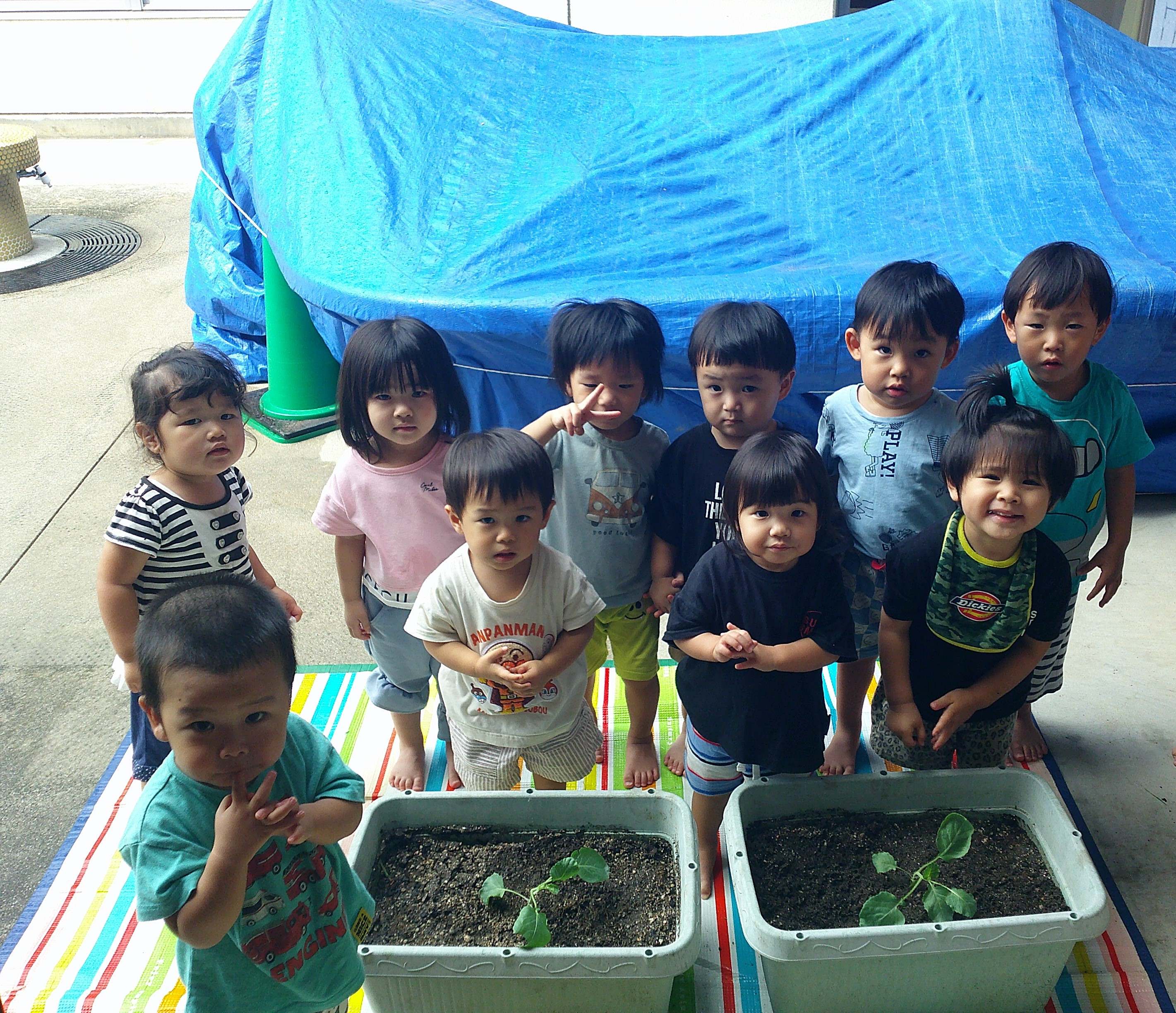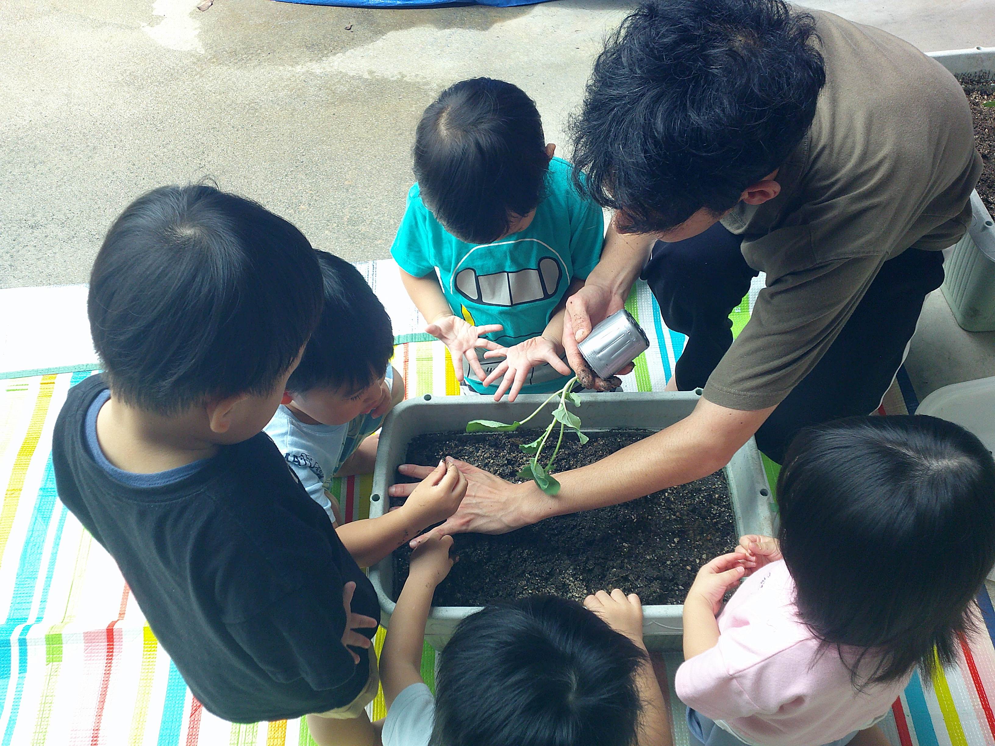 子ども達と一緒に、ブロッコリーの苗を植えました。子ども達に苗を見せると優しく葉を触っていました。「土のお家に入れてあげようね」と声をかけると「おおきくなってね」「ポンポン」「つちのおふとん、ふわふわー」と言いながら土をかぶせていました。