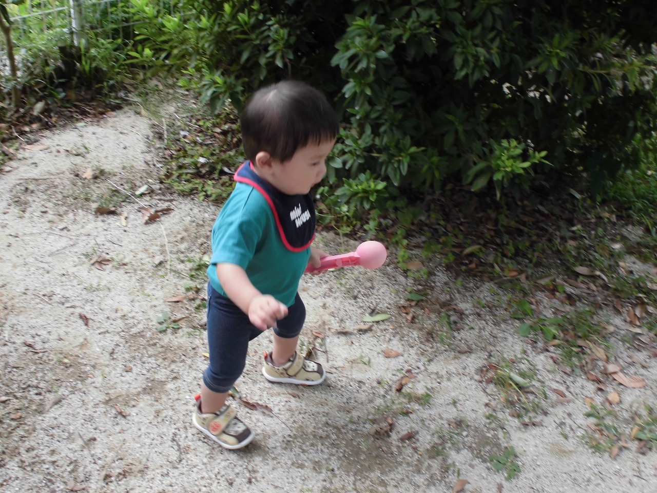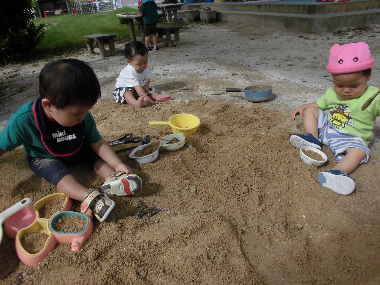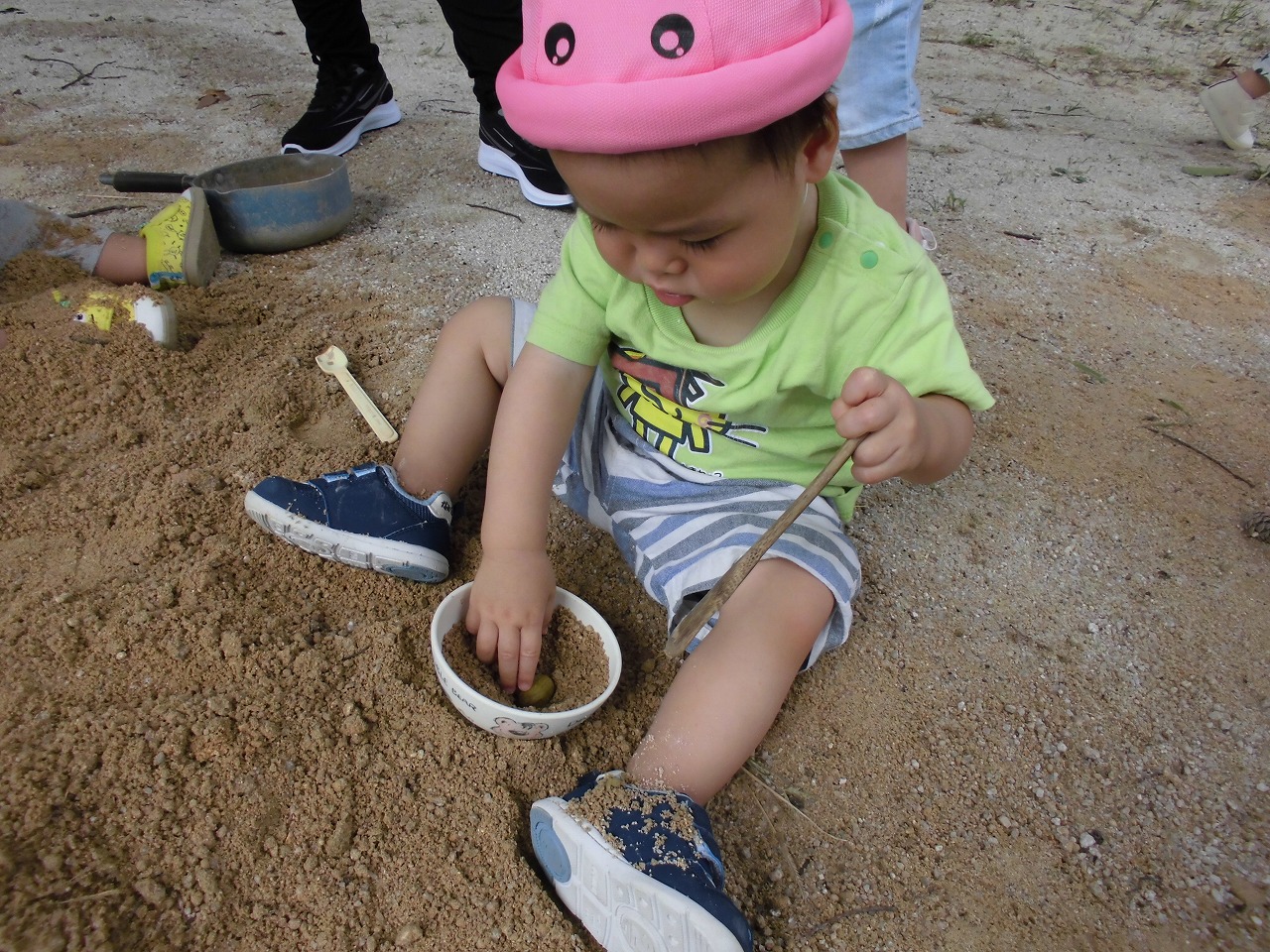 暑さが和らぎ外で遊ぶ事が楽しい季節になりました。0歳児のお友達も砂の感触をスプーンや手で感じて楽しんでいます。また、歩けるようになったお友達は所庭をお散歩して新しい発見に驚いたり喜んだりしていますよ。春とは違う所庭の景色を楽しみながら、お外でたくさん遊びたいと思います。