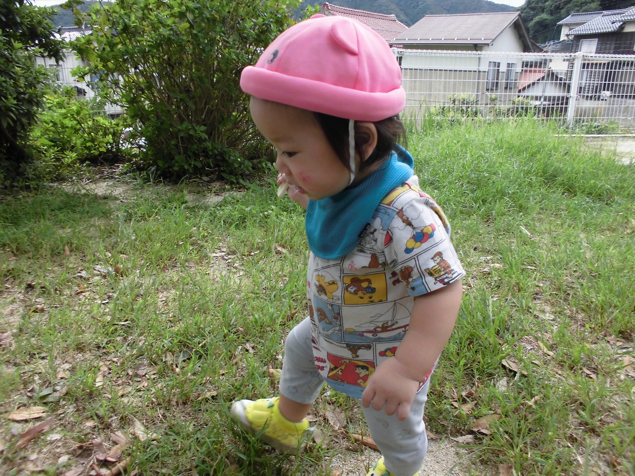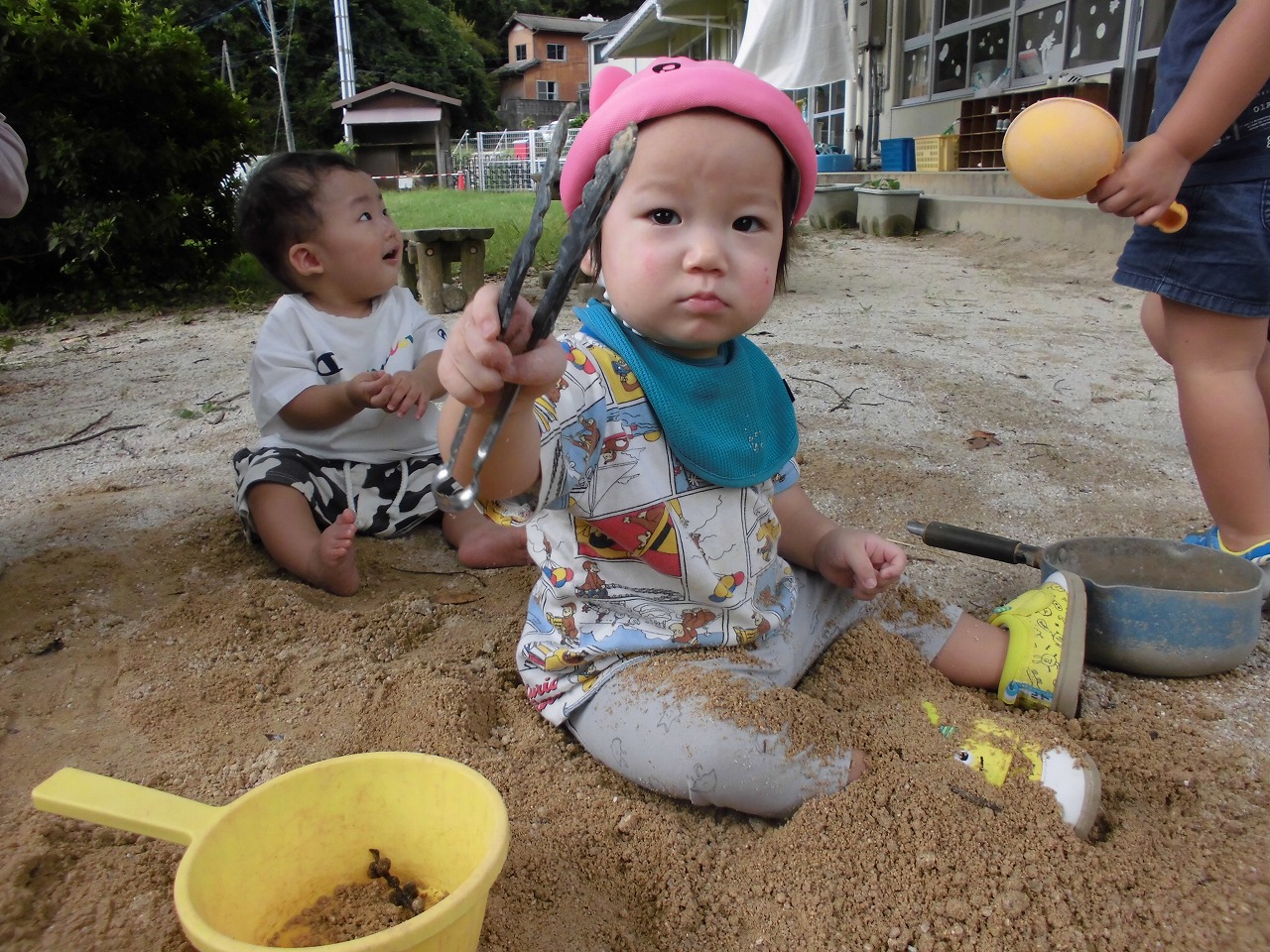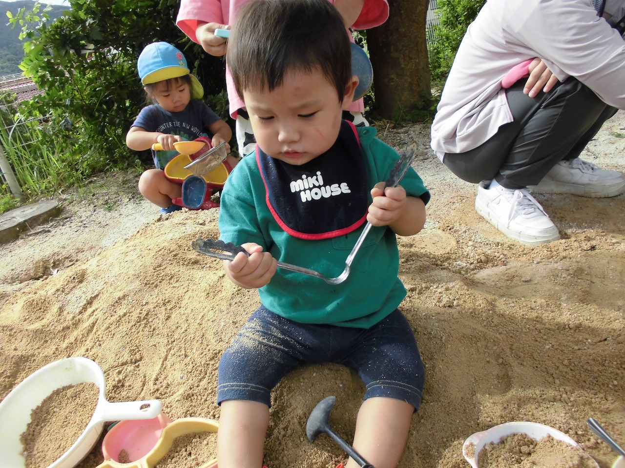 暑さが和らぎ外で遊ぶ事が楽しい季節になりました。0歳児のお友達も砂の感触をスプーンや手で感じて楽しんでいます。また、歩けるようになったお友達は所庭をお散歩して新しい発見に驚いたり喜んだりしていますよ。春とは違う所庭の景色を楽しみながら、お外でたくさん遊びたいと思います。