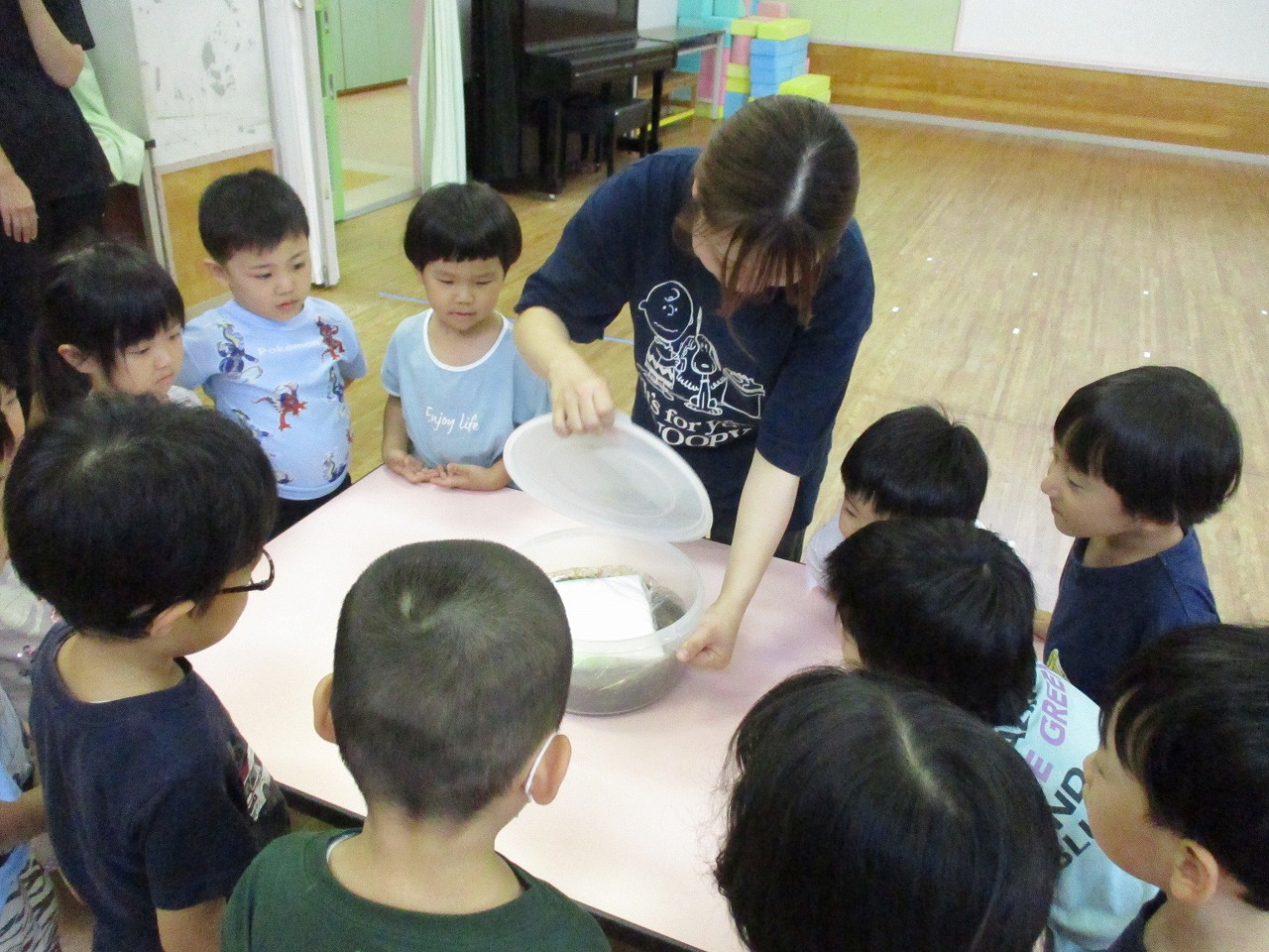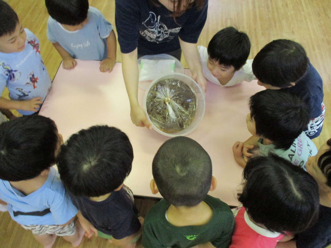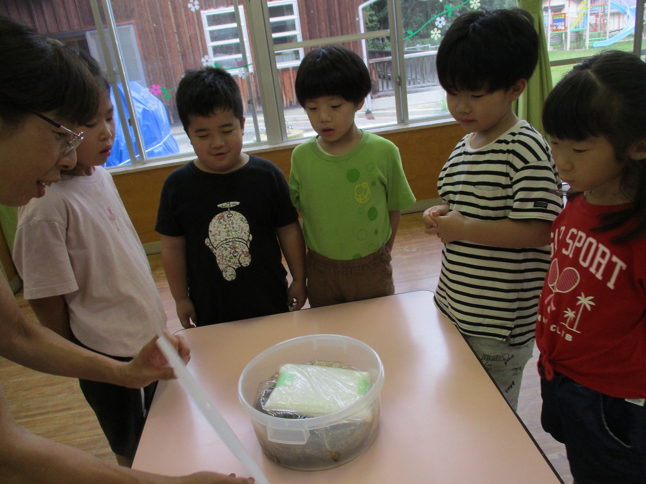 「最初は何色だった?」と尋ねると「黄色だったよ」と即答する子が多く、よく覚えていたことに感心しました。いざ開封してみると「茶色だ~!」「チョコレートみたいだね」と色が変わったことにビックリしている子もたくさんいました。