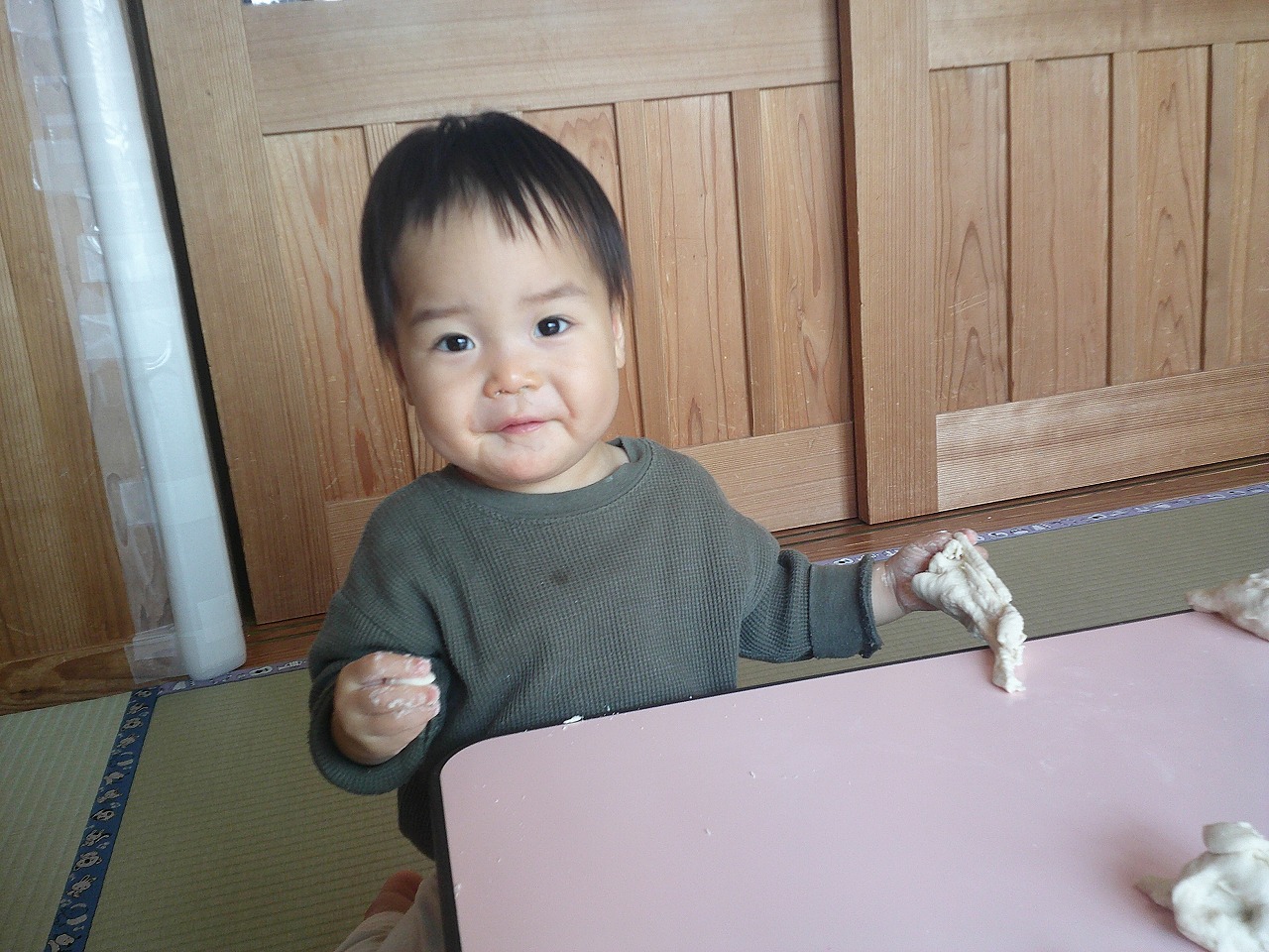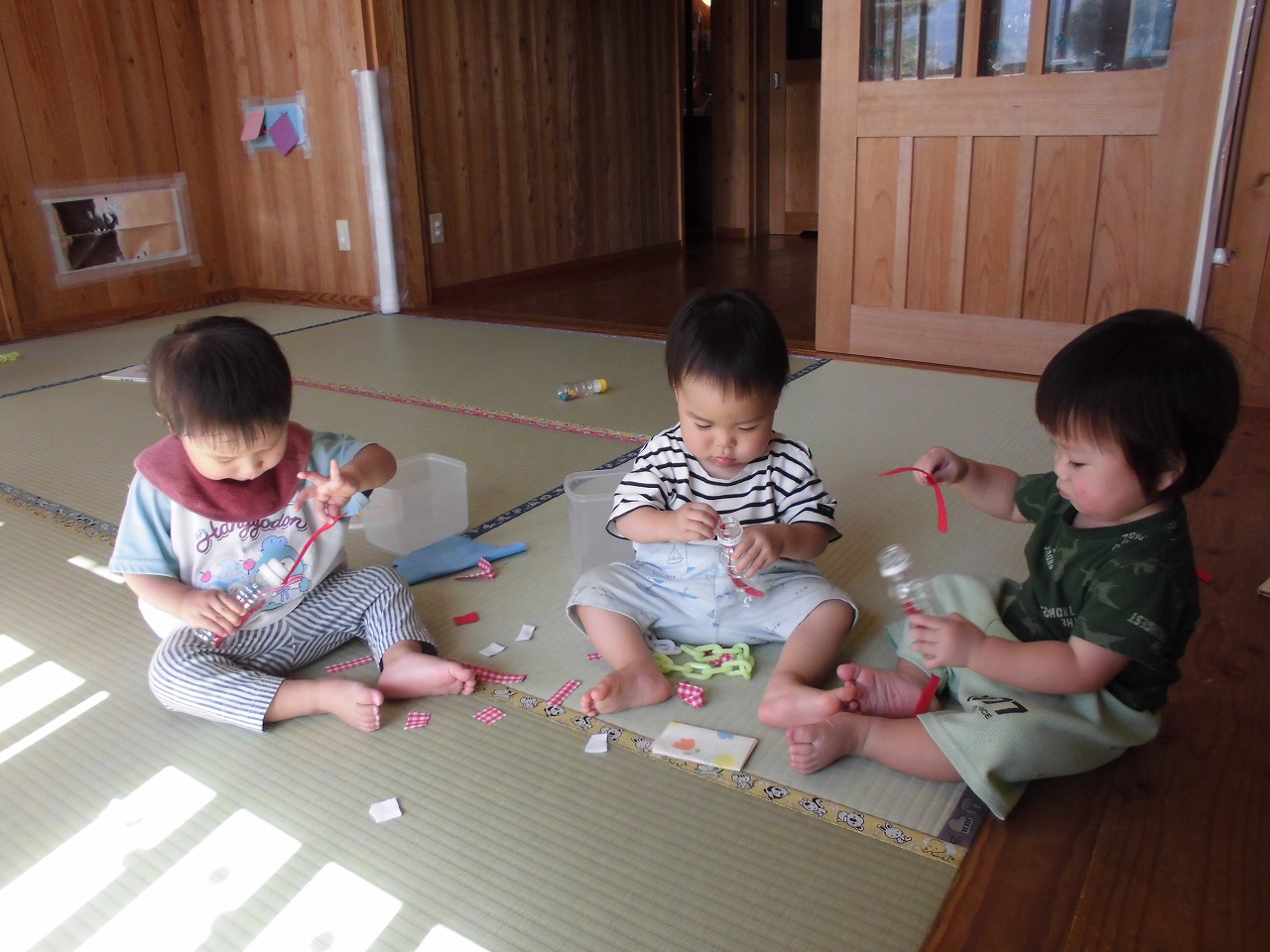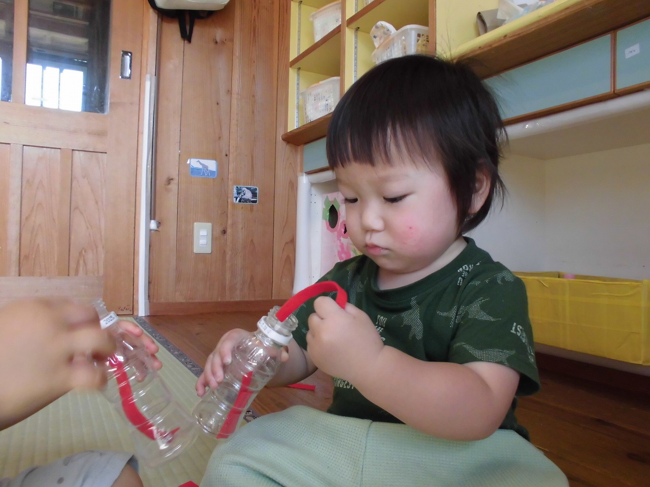 小さいペットボトルにフェルトを入れて遊んでいるよ