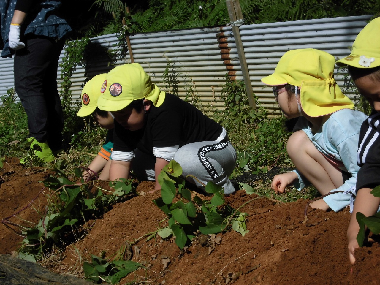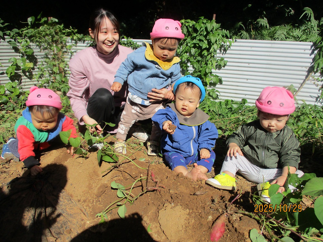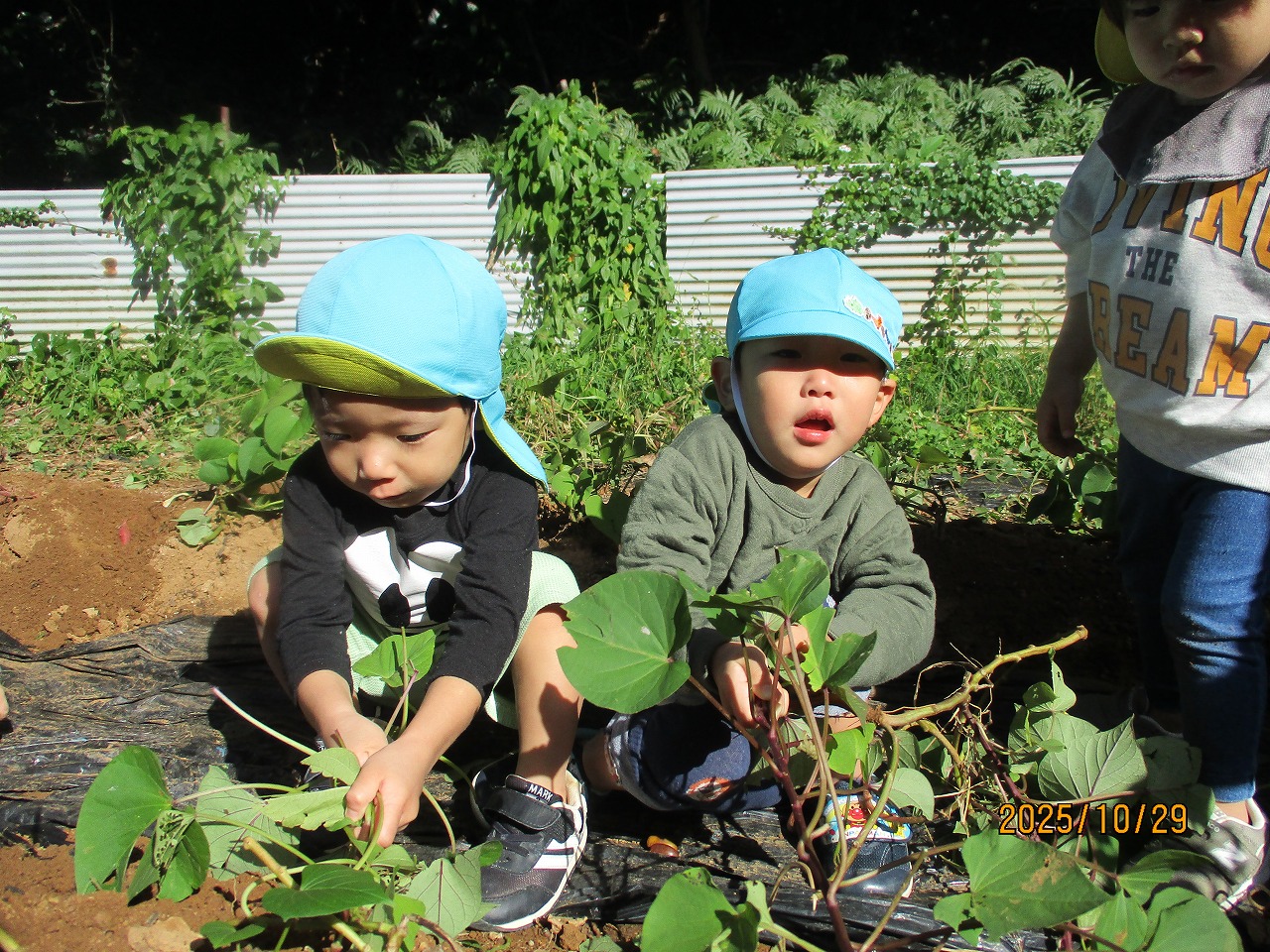 秋晴れの空の下、保育所の畑でさつま芋を掘りました。