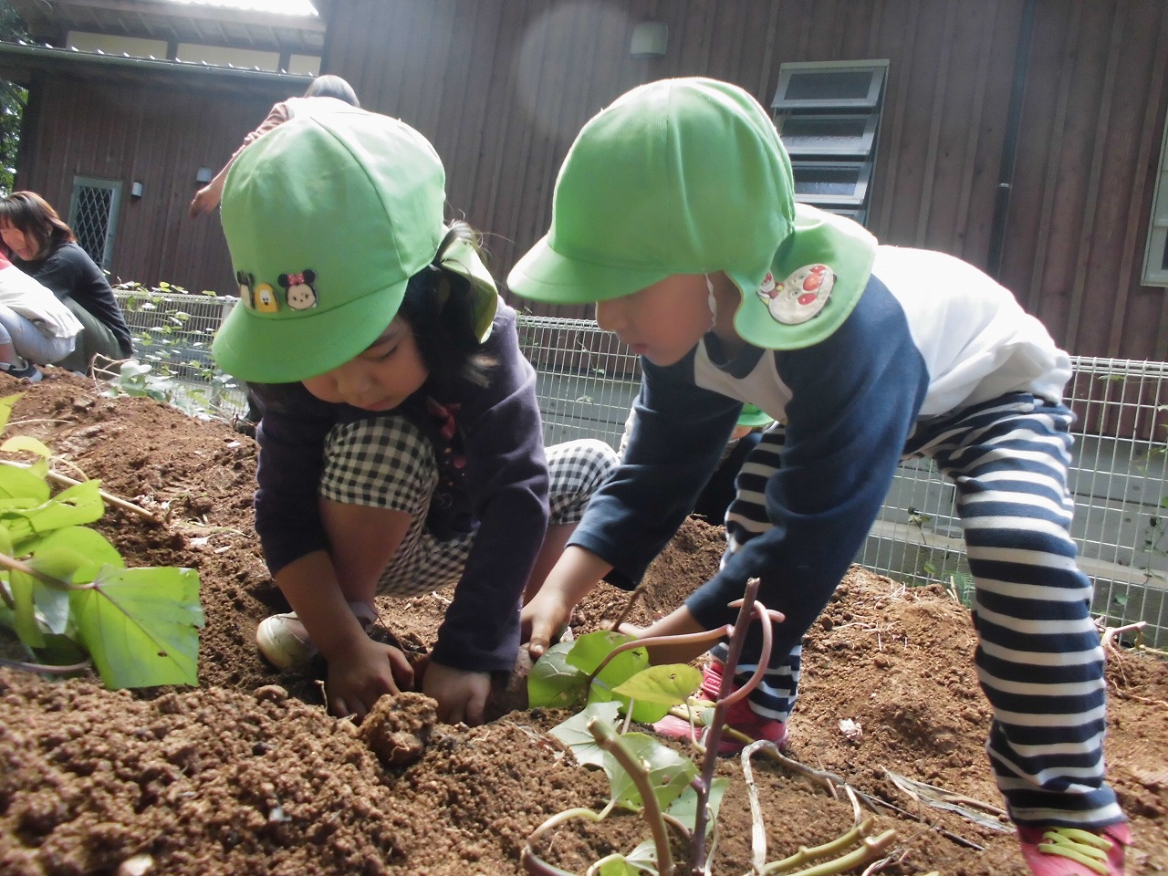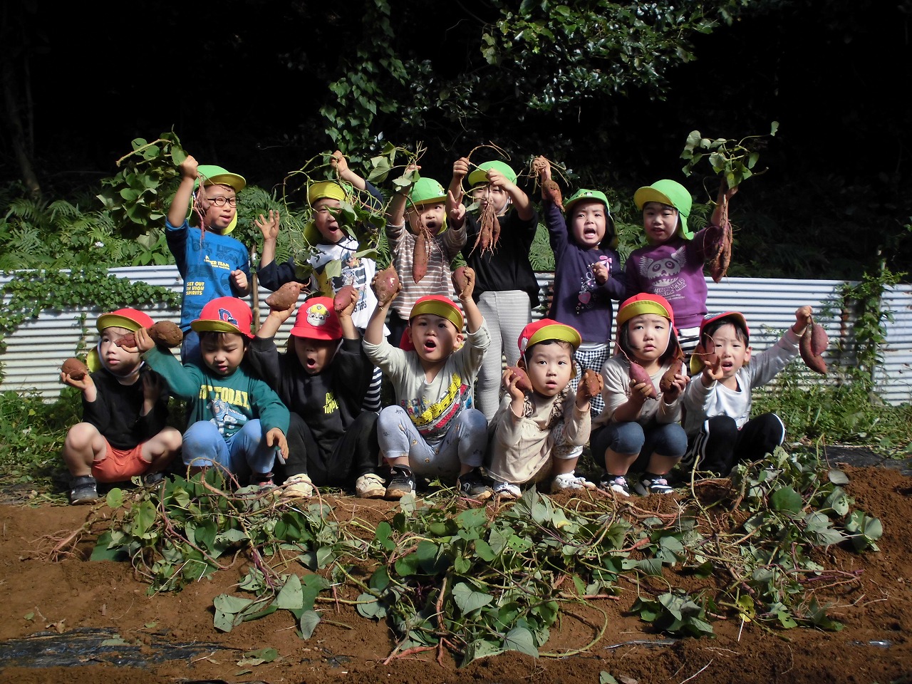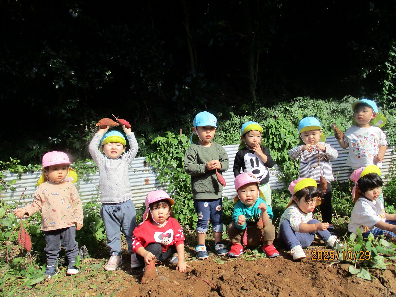 秋晴れの空の下、保育所の畑でさつま芋を掘りました。