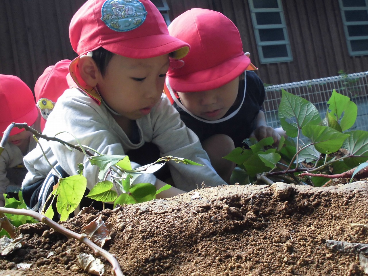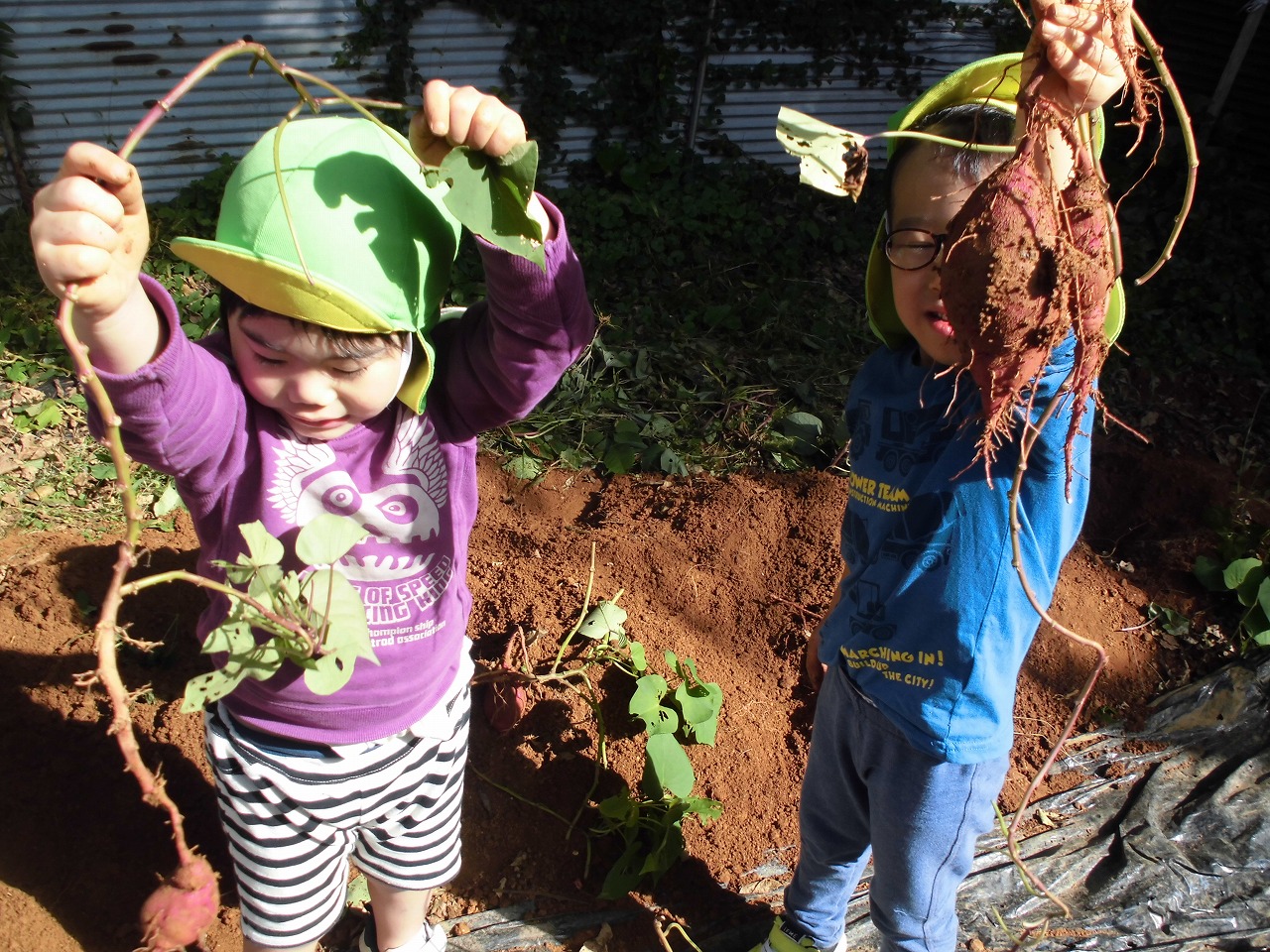 さつま芋のツルの下を掘ることを教えてもらってから掘り始めた子ども達。さつま芋が頭を出すと目を輝かせ、指先をしっかり使って周りの土を一生懸命掘っていました。掘り起こしたさつま芋を見てニッコリ!芋の形を見ながら「だんごみたい」「レンコンみたい」「これ長いよ」と持ち上げて見せ合っていました。ツルを引っ張り「やぶれちゃった」と残念がったり、紫色の根っこを見つけ、この先にはきっとさつま芋があるはず…と掘る子どももいましたよ。また、なかなか掘れないと「手伝って!」と友達に協力を求め、一緒に掘り喜び合う姿がありました。