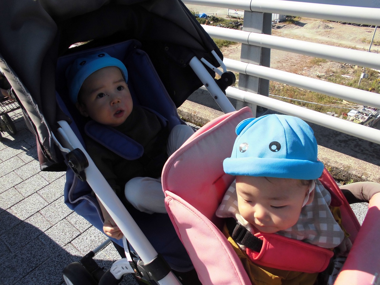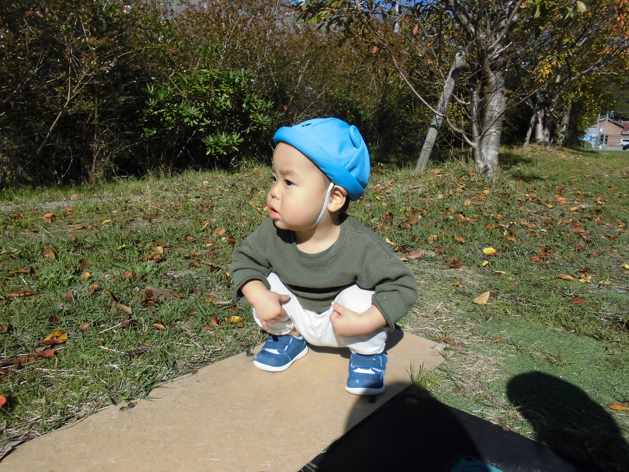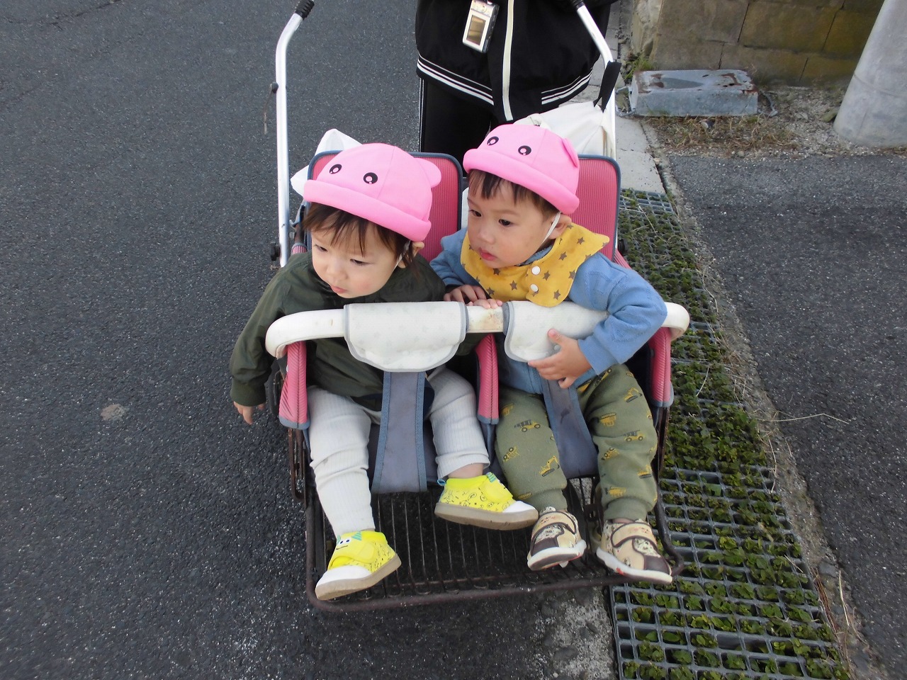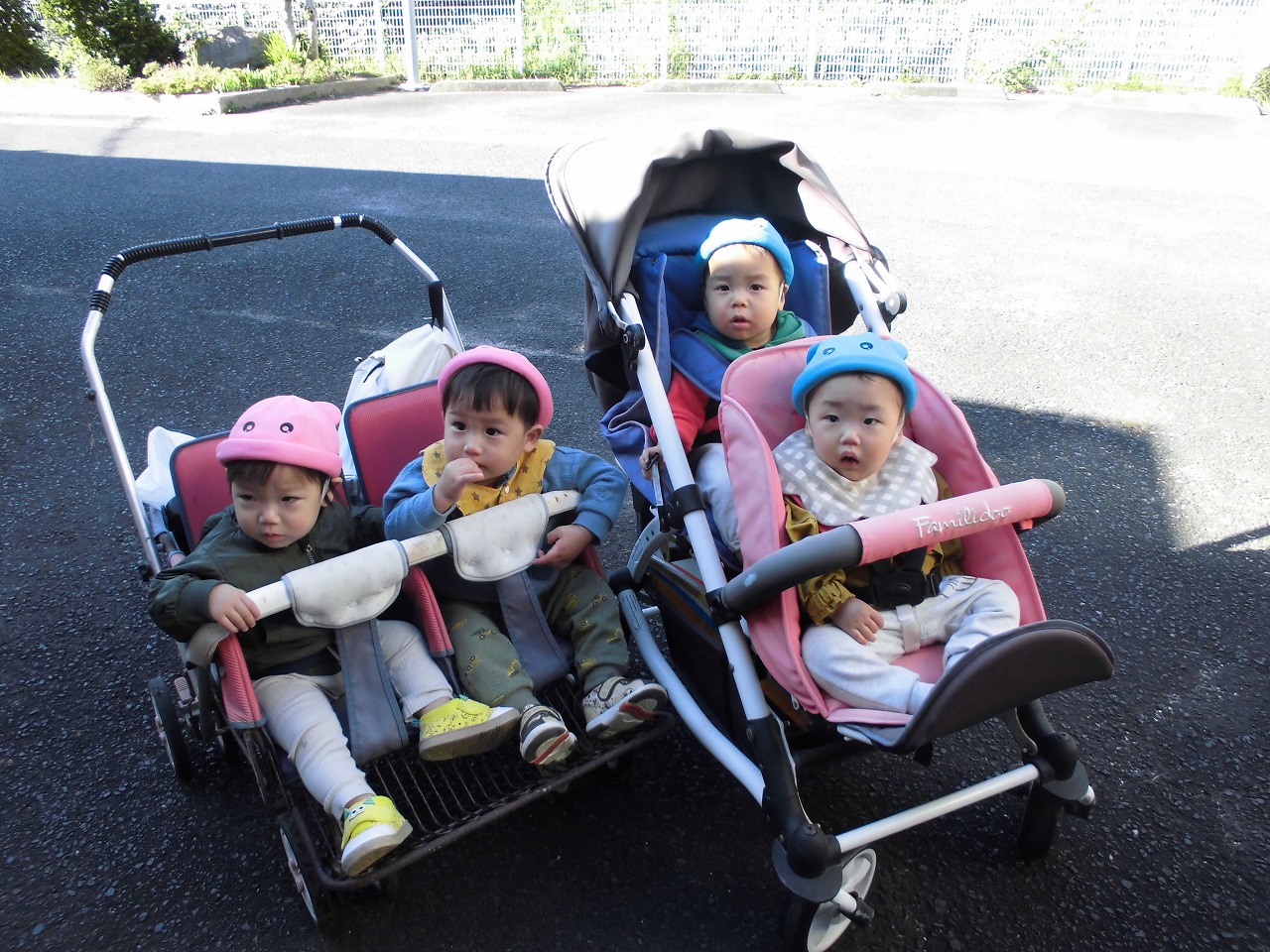 天気がいい!暖かい!絶好のお散歩日和!0歳児はベビーカーに乗って神名火公園まで行きました。「あ!」「お?!」と目に映るものを指さし「あれはなんだ?」と保育士やお友だちに話しかけたり、心地よい風に眠気を誘われたり、金木犀の良い香りに癒されたりしながら、みんなで元気に公園まで行きました。