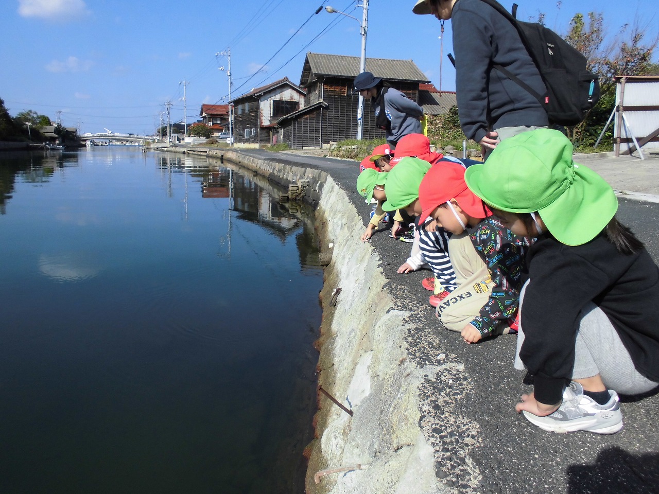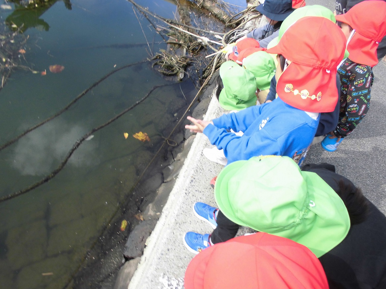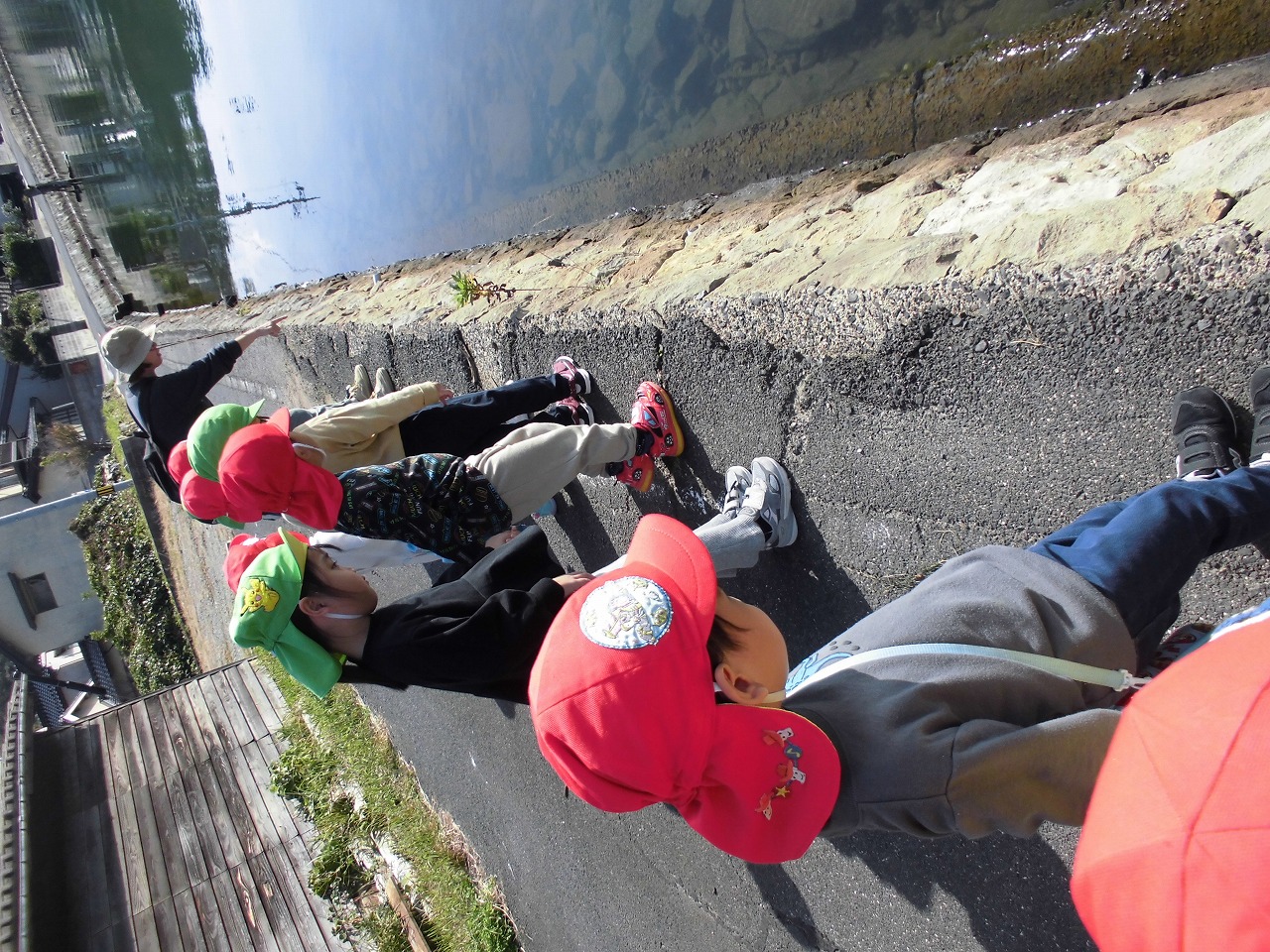川をそおっと(気をつけてねと声をかけながら)のぞきこんで大きな鯉やカニを見つけた子ども達!「しーっ!かにさんが穴に入っちゃうよ」「カニさんは恥ずかしがり屋さんだね」なんて言いながら、みんなにっこり見ていましたよ。