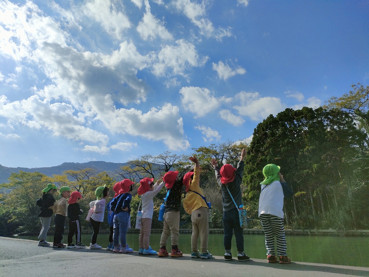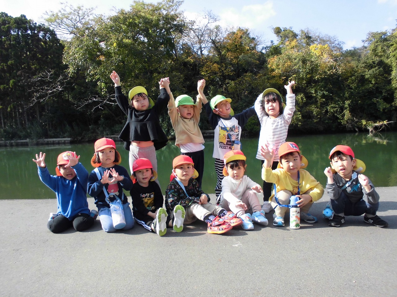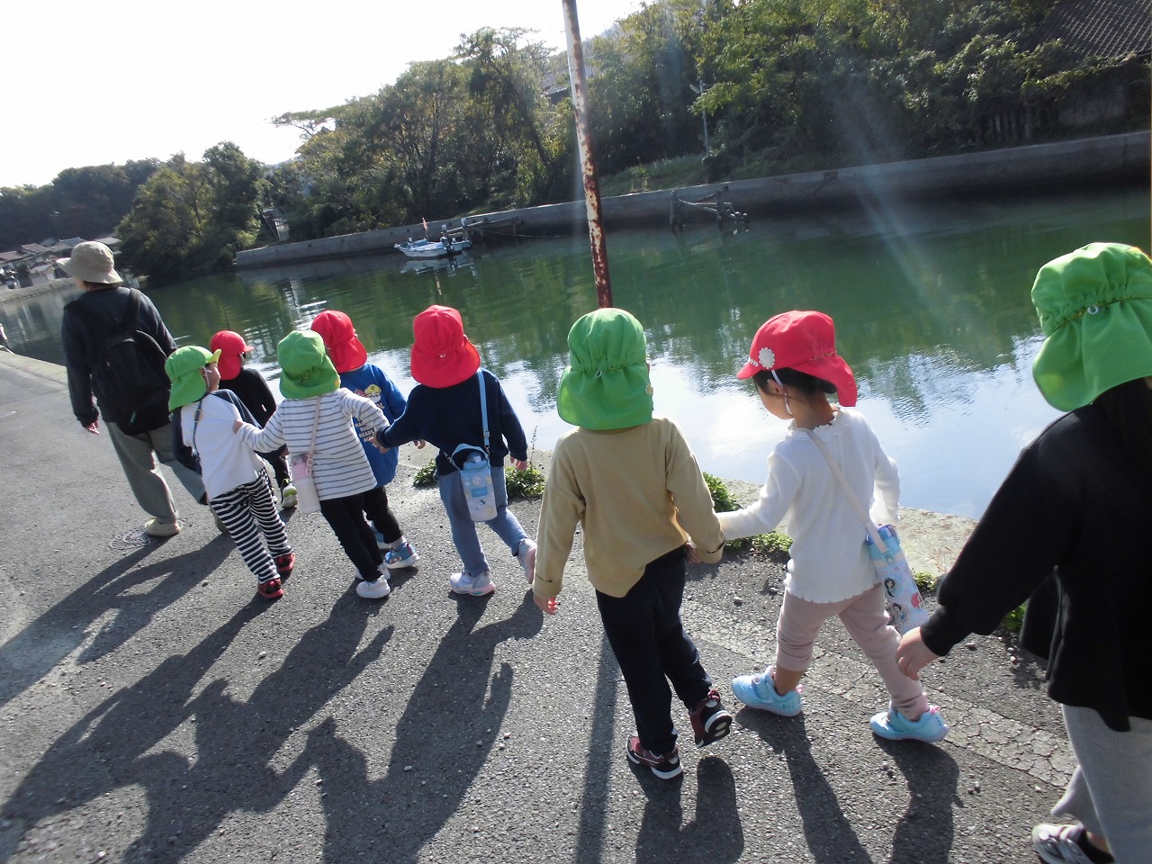 川をそおっと(気をつけてねと声をかけながら)のぞきこんで大きな鯉やカニを見つけた子ども達!「しーっ!かにさんが穴に入っちゃうよ」「カニさんは恥ずかしがり屋さんだね」なんて言いながら、みんなにっこり見ていましたよ。