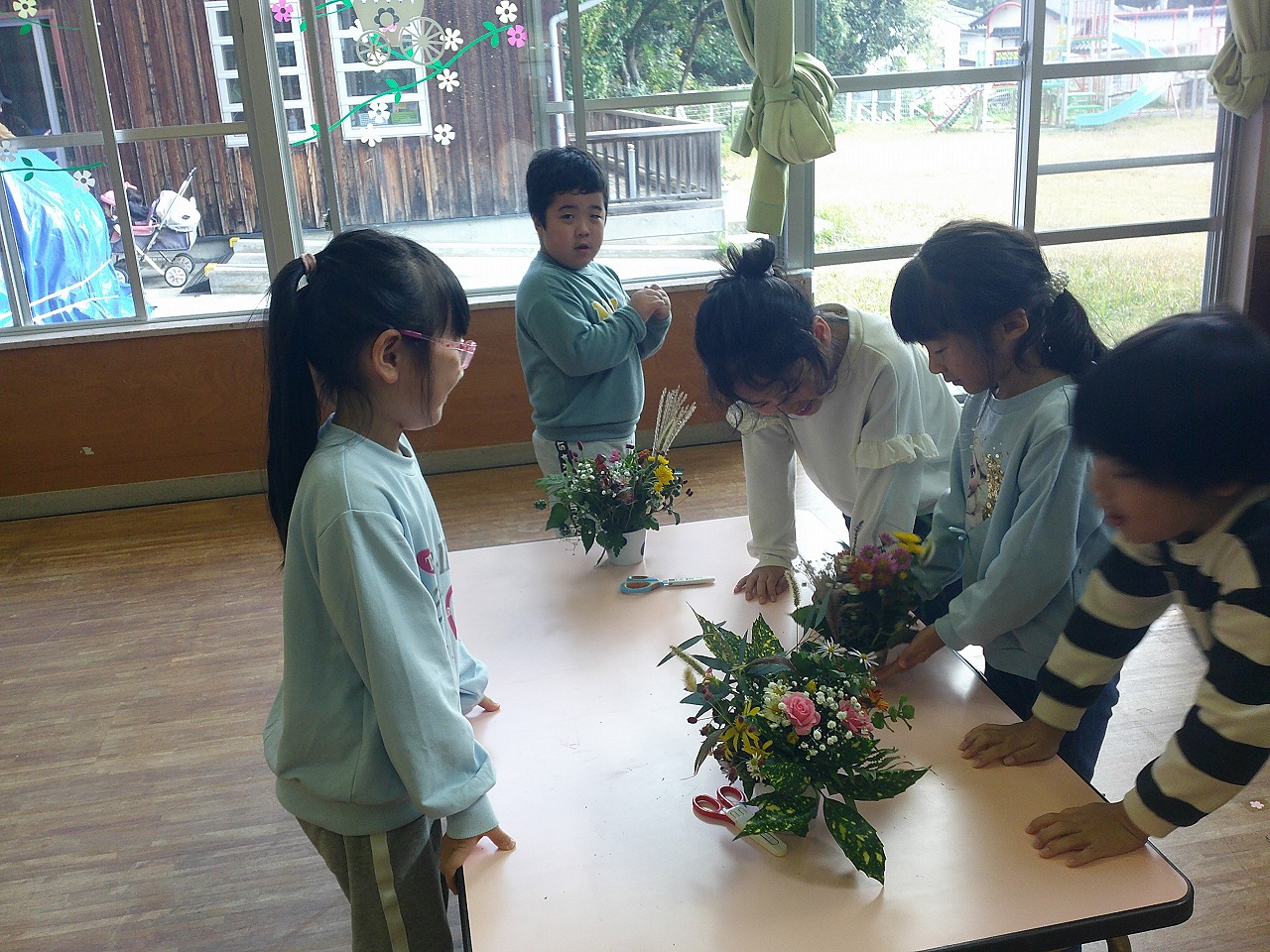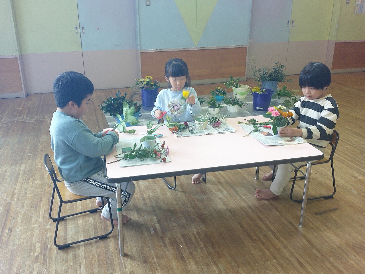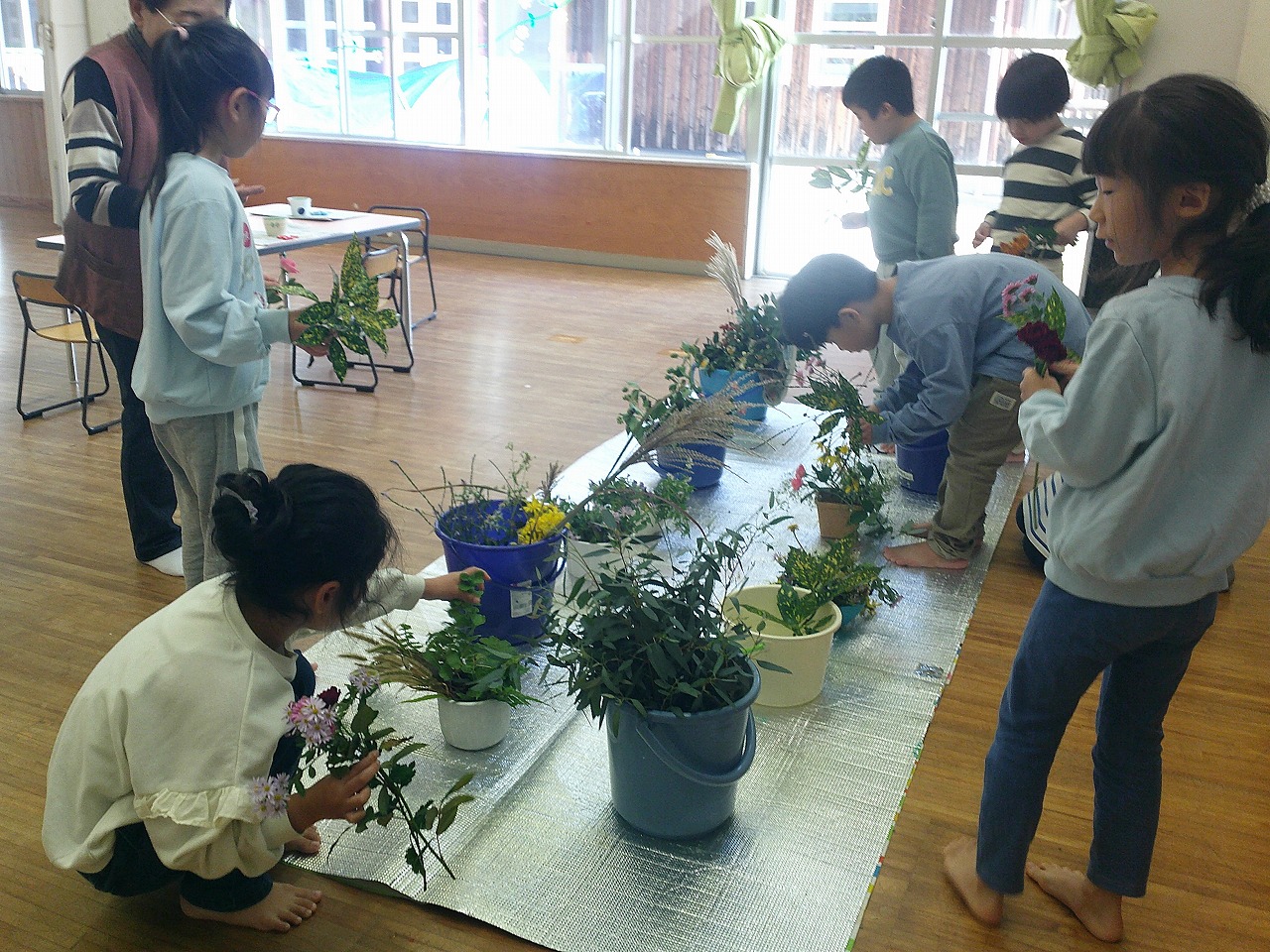 伊東先生に花を生ける手本を見せていただくと「先生みたいにしたい」と、いろいろ考えながら花材を選びました。「どれにしようかな」「このお花は摘んできたのだ」「このお花可愛いからこれにしよう」といって嬉しそうに選んでいましたよ。