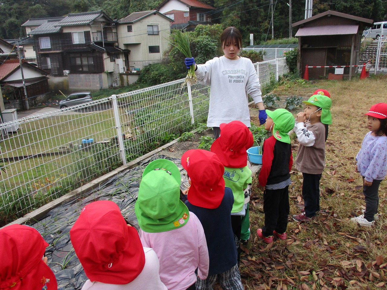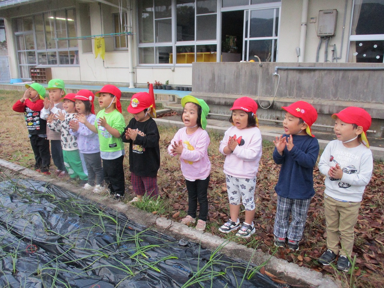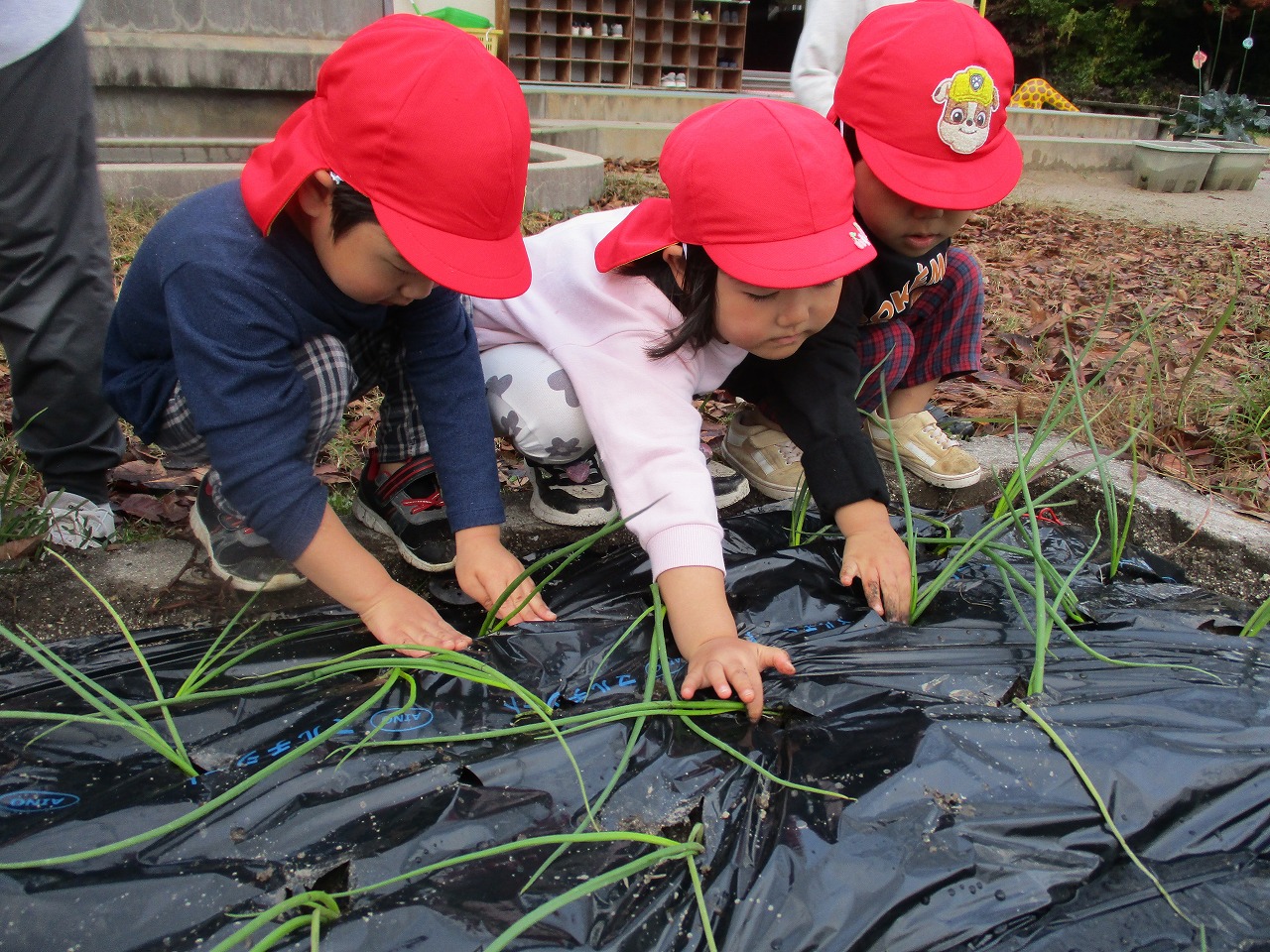 玉ねぎの苗を植えました。今年度、玉ねぎを使用したクッキングを何度も行い、食べる喜びを感じた子ども達です。 来年度も豊作を願って1つ1つ大切に植えました。きりん組の子ども達の「おおきくなあれ!」「おいしくなぁれ!」の思いが玉ねぎに届きますように。大切に育てていきたいと思います。