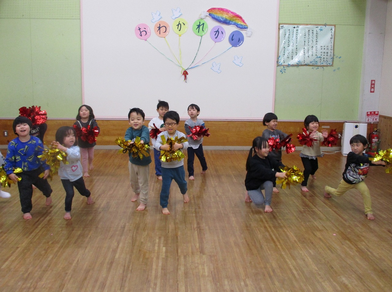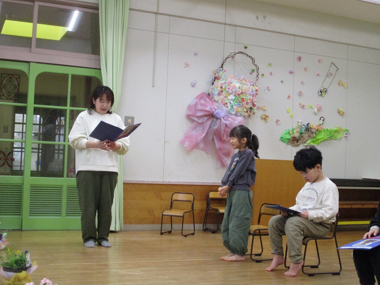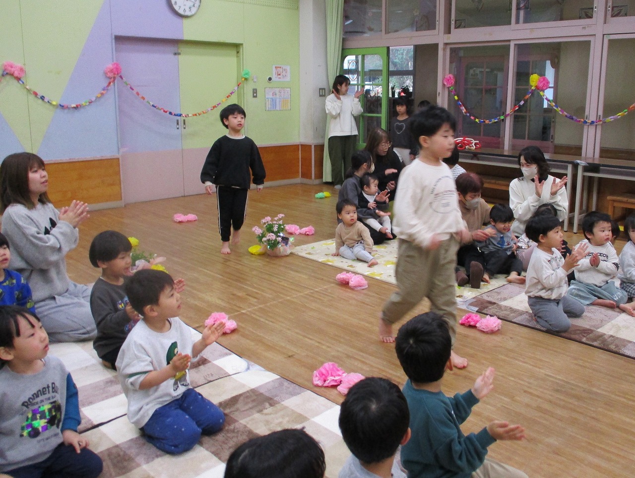 各クラスからの出し物では、どのクラスも元気よく歌や踊りを披露しましたよ。また、職員が子ども達一人一人に小さい頃の話や成長した姿などを伝えると温かい雰囲気に包まれました。