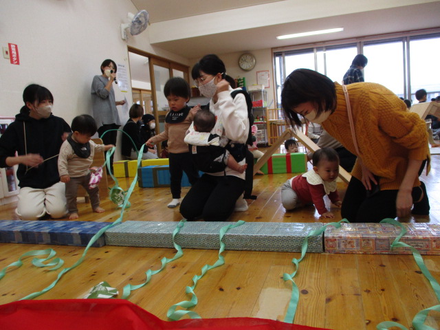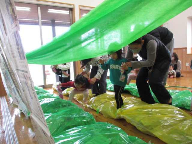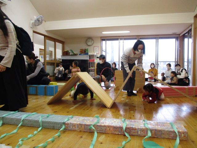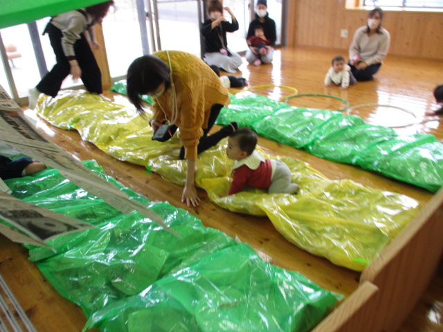 今日はミニ運動会をしました。親子でおいもほりをしたり、新聞クッションの道を通ってみたり…。楽しい時間を過ごしました。