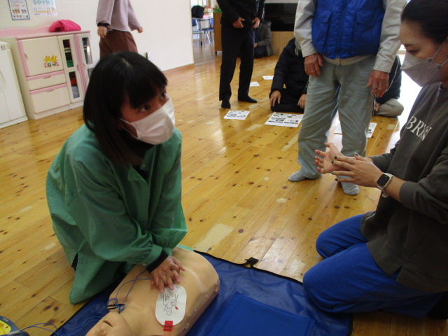 地域の方々や保護者、職員も一緒にAED講習を行いました。児童館だけでなく、地域の防災力の向上に繋がればと思います。