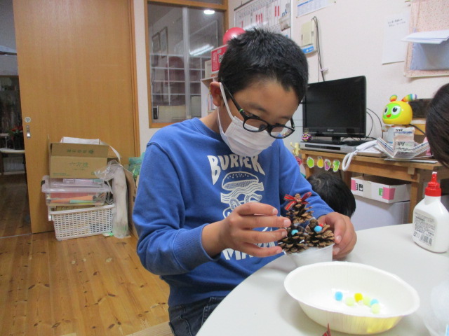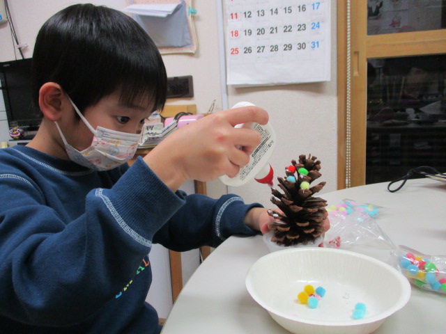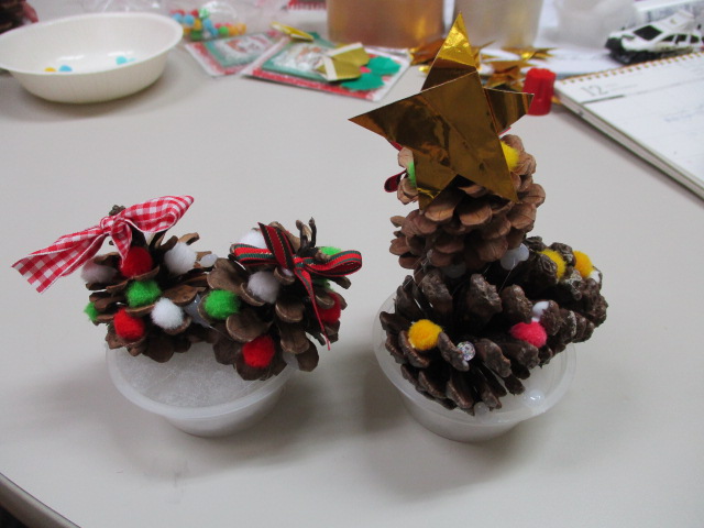 小さな松ぼっくり、大きな松ぼっくりを使ってツリー作りをしました。飾りを選んでボンドでくっつけて、それぞれ素敵なツリーができました♪