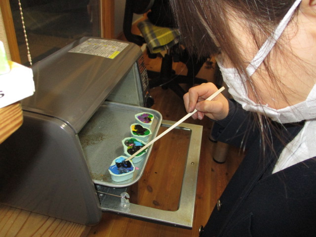 今日は天候が思わしくなく、「館庭遊び」を「クレヨン作り」に変更して遊びました。小さくなったクレヨンをシリコン型に入れ、トースターへ。クレヨンの色によって溶ける早さが違うことを発見していましたよ。