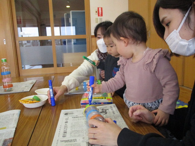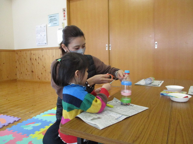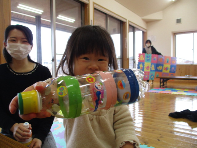 ペットボトルを使って手作りおもちゃを作りました。マジックでお絵かきしたり、好きなシールを貼ったりして、オリジナルのビー玉落としのおもちゃができました♪