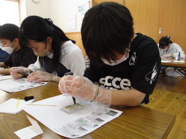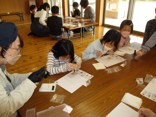 今日は講師の山田さんに、レジンキーホルダー作りを教えていただきました。説明をしっかり聞いて、集中して仕上げることができました。温度で色が変わるレジンだったので、作った後も冷やしたり温めたりして楽しむ子どもたちでした。