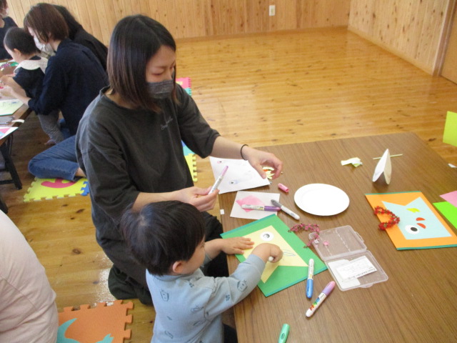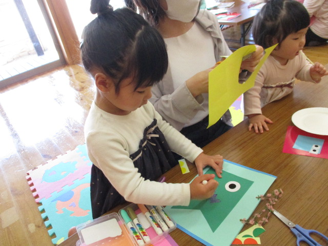 シールやお絵かきをしてこいのぼりバックを、足形こいのぼりで揺れる飾り作りをしました。2つ作ったので工程が沢山でしたが、親子で可愛いこいのぼりを作ることができました。