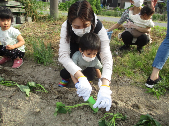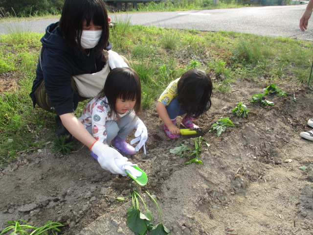 未就学児の親子さんも一緒に、さつまいもの苗植えをしました。館長より苗の植え方を教わり、100本の苗を植えることができました。土の感触や畑にいるダンゴムシなどにも触れ、それもまた楽しかったようです。秋の収穫が楽しみです♪