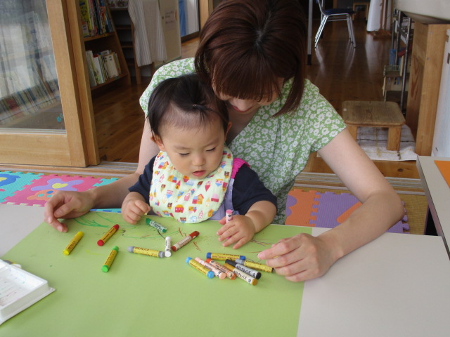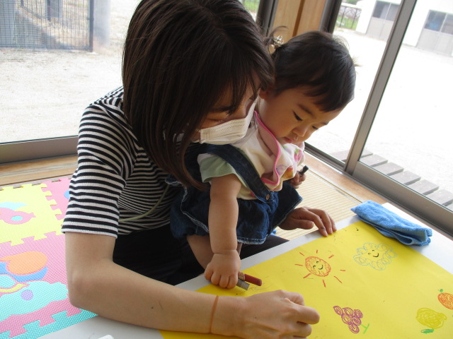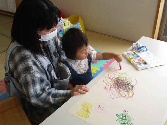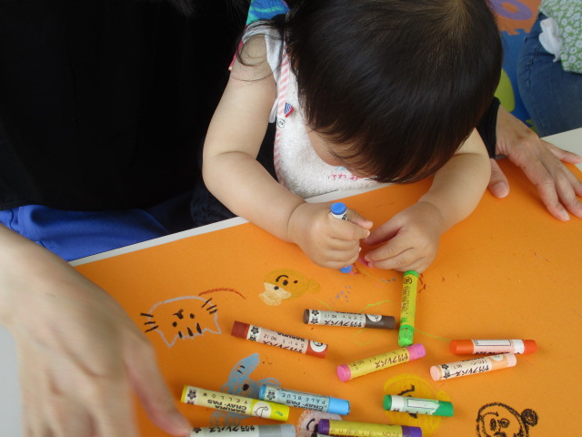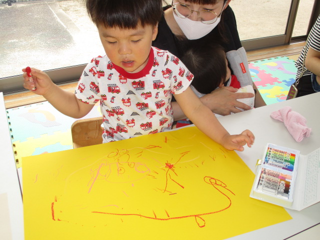 クレパスを使って画用紙にお絵かきをしました。クレパスをトントンしたり、手に握ってぐるぐるしたり…。画用紙いっぱいにお絵描きを楽しみました♪