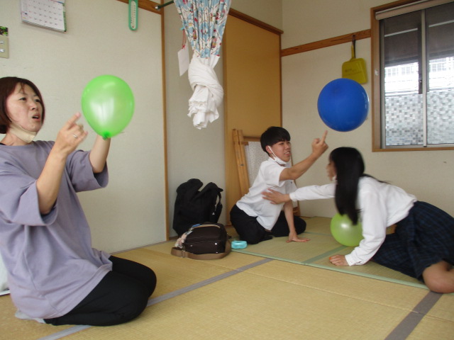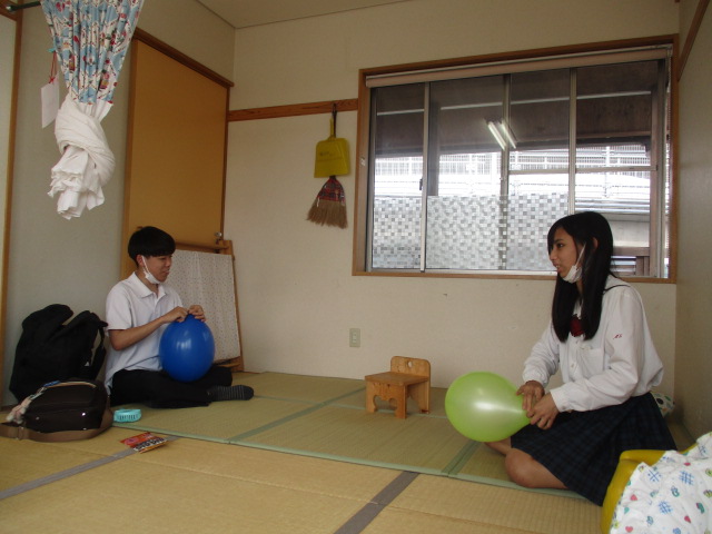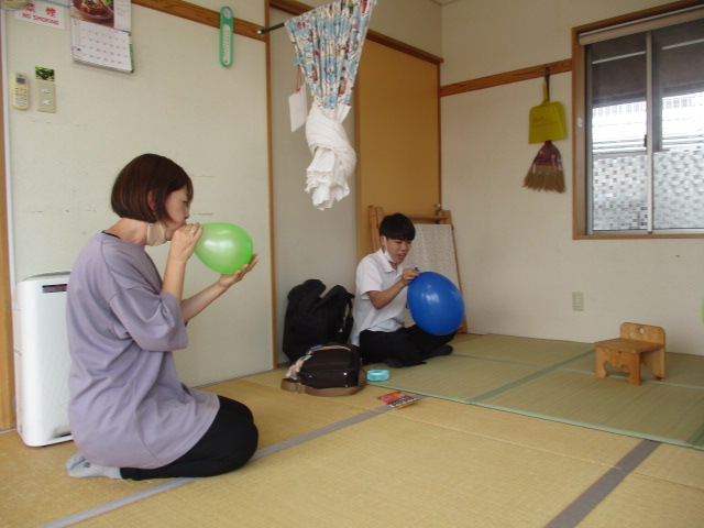 今日の児童館活動は「風船遊び」でした。誰が一番早く膨らますことができるのか職員も一緒に参加し、さすが高校生!大きな風船を一気に膨らますことができました!
