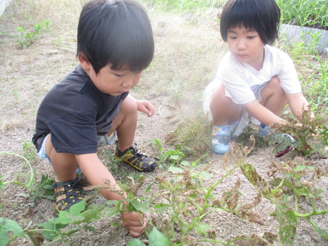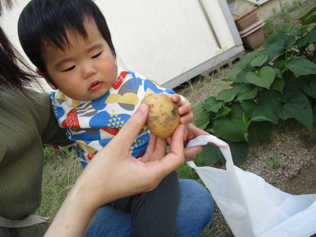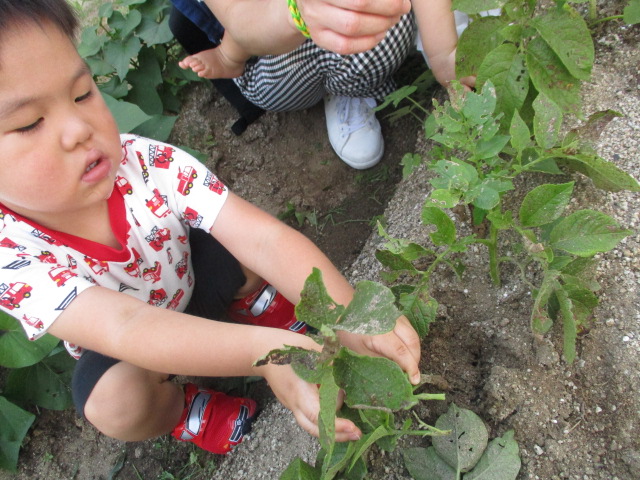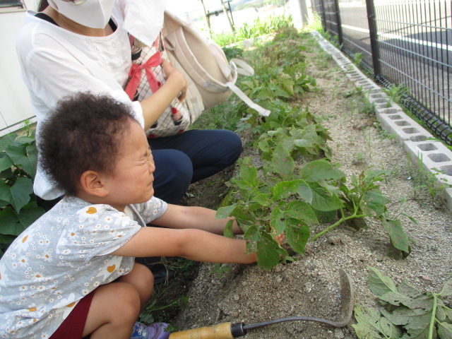 児童館裏の畑に植えたじゃがいもが大きくなり、芋掘りをしました。土の中から出てきたじゃがいもを見て、「みて!おおきいのとちっちゃいの!」「あっ、こっちにもあるよ!」と夢中で掘っていました。