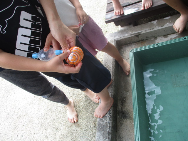 水風船で遊んだことはあっても、作るのは初めて。作り方を説明し、子ども達で水風船作りをしました。始めはうまく膨らまなかったり水が入らなかったりしましたが、何度も挑戦していると、コツや水の入れ方を覚え、1時間も夢中で作っていましたよ。