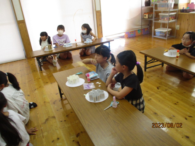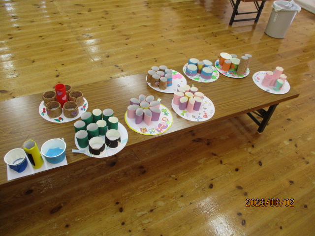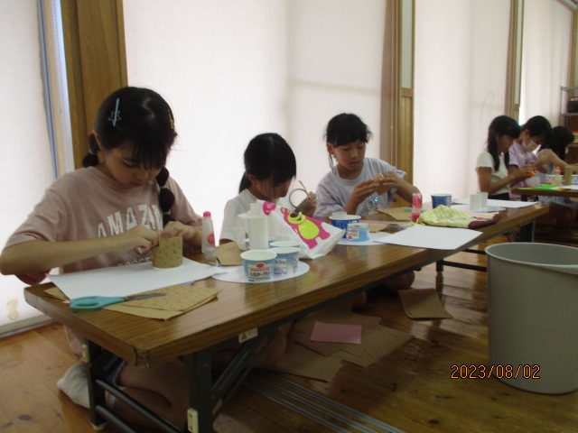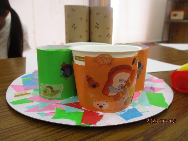 トイレットペーパーの芯やヨーグルトカップの廃材を使ってペン立て作りをしました。