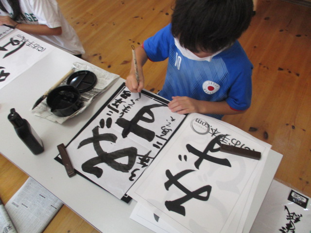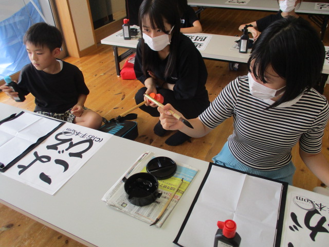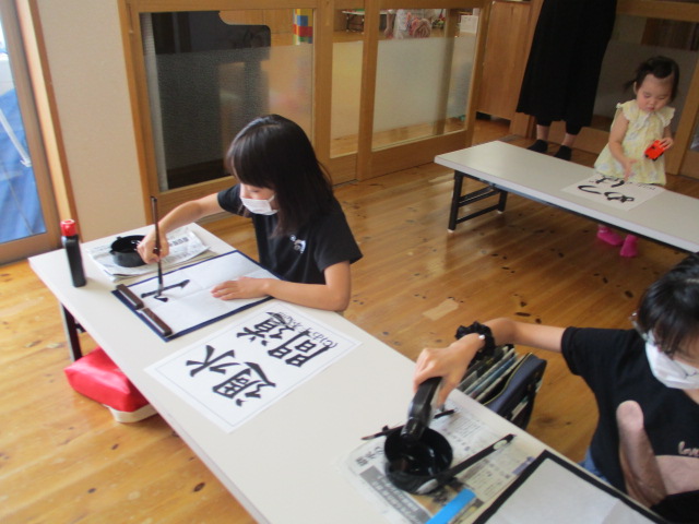 児童館活動で習字をしました。高校生のボランティアさんに教えてもらいながら、みんな一生懸命書いていました。