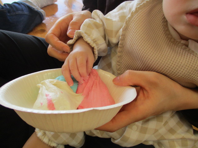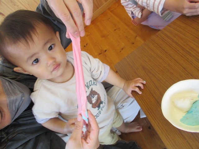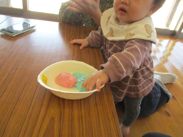 今日は小麦粉粘土遊びをしました。はじめての感触に戸惑う子もいましたが、少しずつ慣れて楽しむ姿がありました。気持ち良くて、ずっと触っている子もいましたよ♪