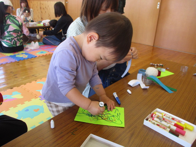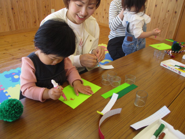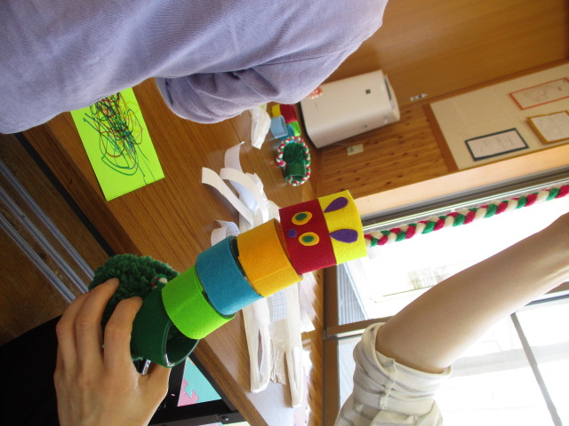 あおむしさんの手作りおもちゃを作りました。お絵かきしたり、フェルトシールを貼ったりして、可愛いおもちゃの完成!できたおもちゃで、紐通しや積み木、覗き込んだりと色々な遊びを楽しむ子どもたちでした。