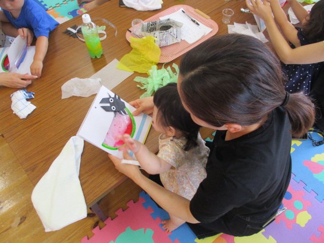 色水遊びをしました。紫色の氷を溶かして魔法の粉を入れると、あら不思議!真っ赤な色水になりました。赤くなった色水はスイカに見立てて工作をしました。お花紙でも色水作りに挑戦!色々な材料で色水を作って遊びました。