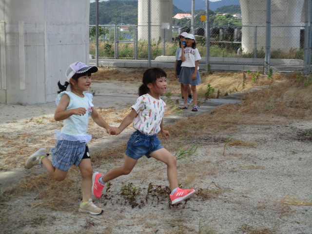 2回目の児童館活動は、広場遊びを行いました。鬼ごっこ、野球、竹馬、だるまさんが転んだなど、色々な遊びをしました。中には、ボランティアの高校生とサッカーを一緒に楽しむ姿も。今日の広場は風があり涼しく、久しぶりに戸外遊びを沢山楽しむことができました。
