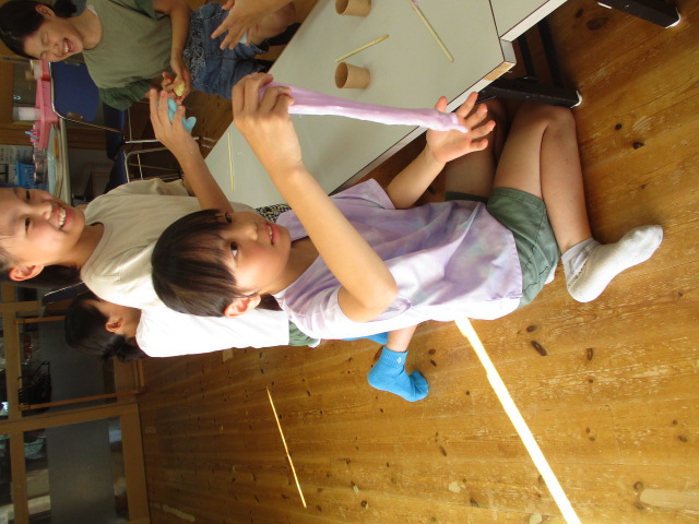 今日は、スライム作りをしました。定番のスライムとふわふわスライムの2種類に挑戦。スライムになっていく様子や感触に大喜びの子どもたちでした。