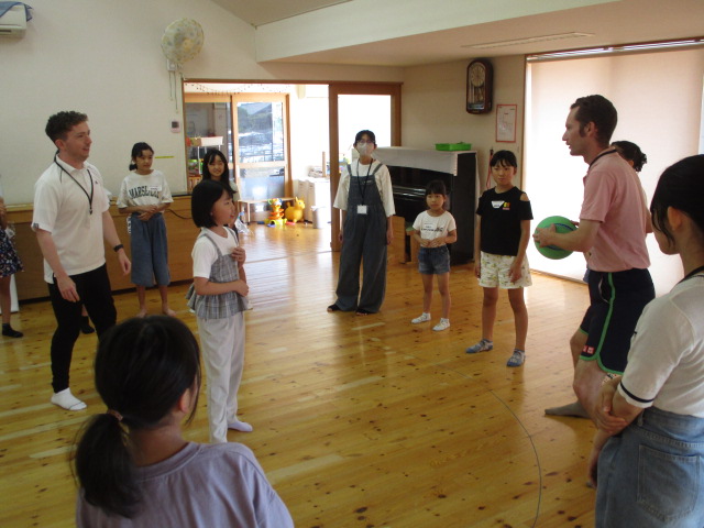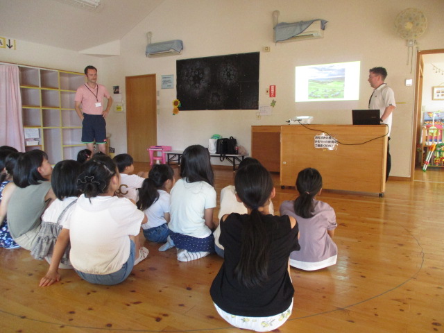今日は、松江市国際交流員のニコラス・マッカラさんとイーサン・オブライアンさんをお招きし、お二人の出身地に関するお話を聞いたり、ゲームをしたりしました。最初は、緊張気味だった子どもたちも最後には、笑顔でお二人と握手する姿が見られました。