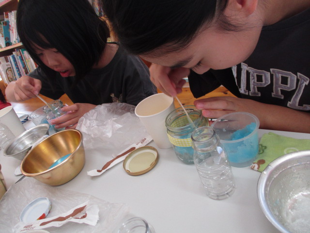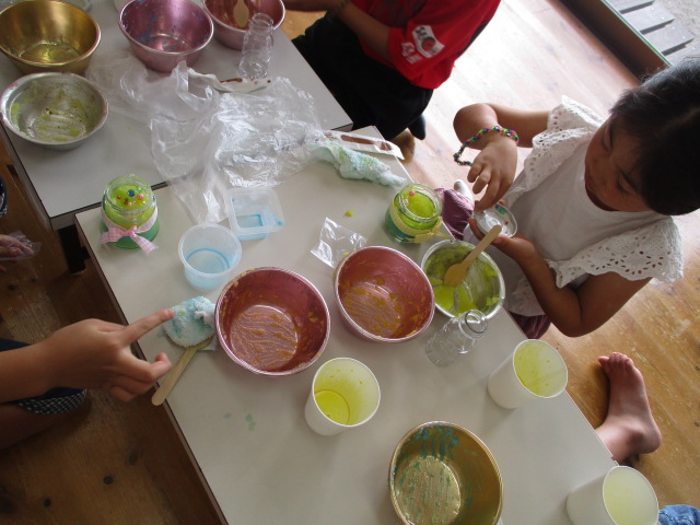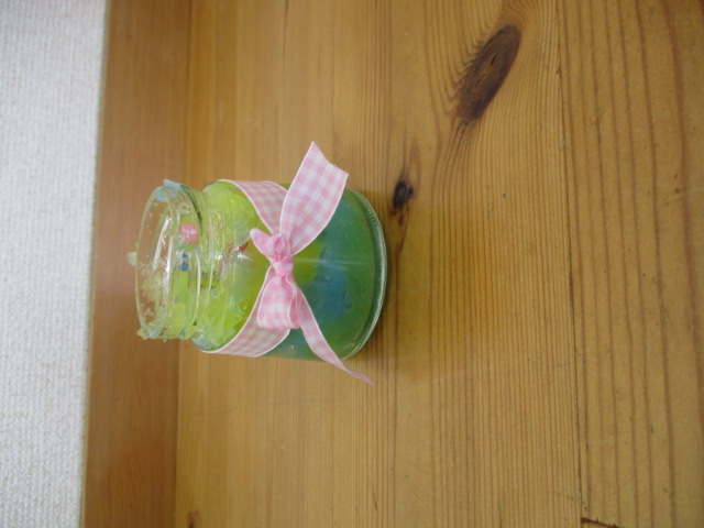 二色の絵の具を子どもたちが工夫しながら、素敵なグラデーションのあるフレグランスポットが出来上がりました。レモンの良い香りが漂っていましたよ。
