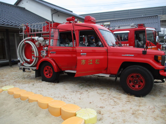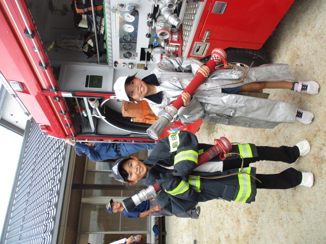 今日は月一回の避難訓練がありました。合わせて、南消防、自治消防の協力のもと、通報訓練と消火訓練も行いました。消火訓練が初めての保護者さんや、消防車に乗るのが初めてのお子さんもいて、皆、貴重な訓練体験ができました。ご協力、ご参加、ありがとうございました。