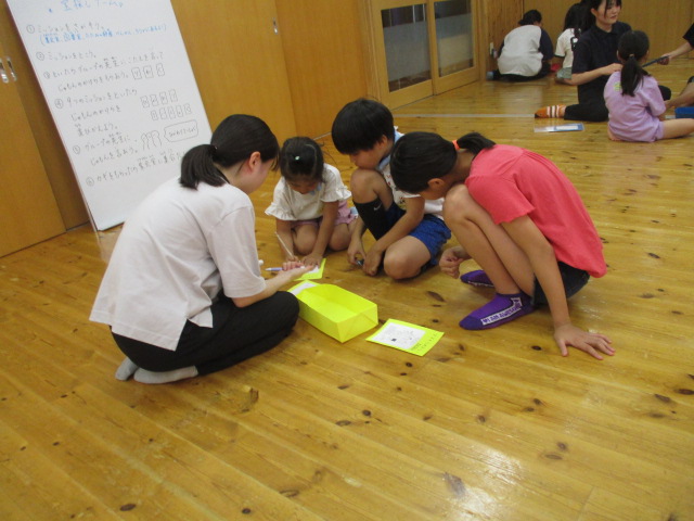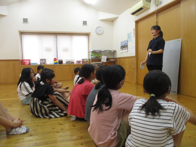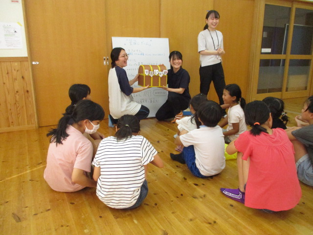 夏休み最後の児童館活動は宝探し。島根県立大学の実習生さんがアイデアを出し合い、謎解きをする宝探しを考えてくれました。中には難しい問題もありましたが、子どもたちは力を合わせ、次々と謎を解いていました。たどり着いた宝箱には素敵な手作りフォトフレームが!大喜びの子どもたちでした。
