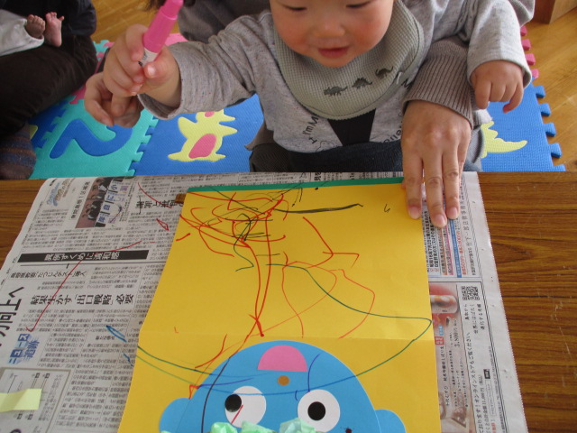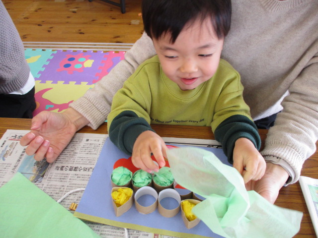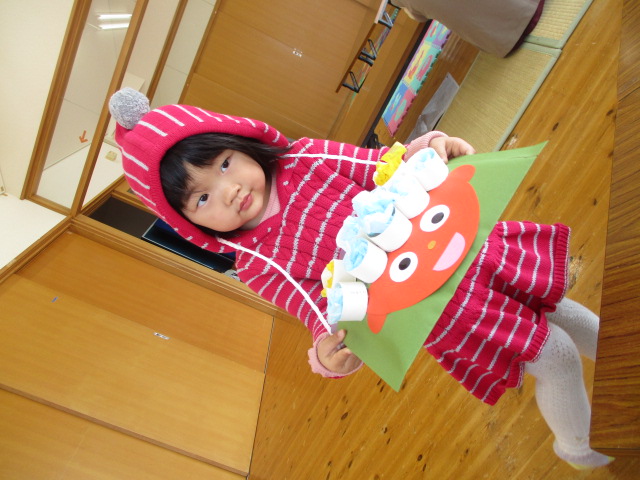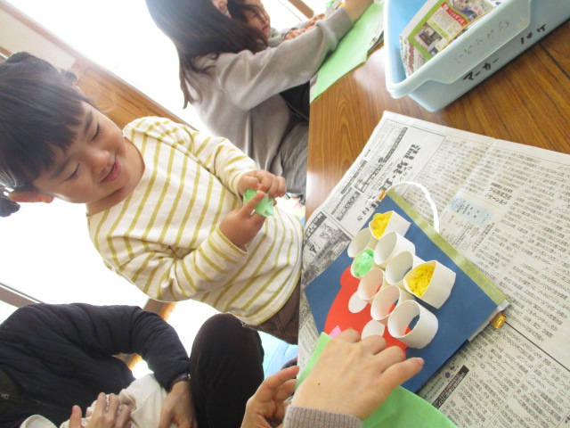 来月2月2日の節分で使う豆入れを作りました。お花紙を丸めたり、マーカーでお絵描きをしたりして、素敵な豆入れバッグができましたよ♪