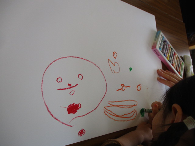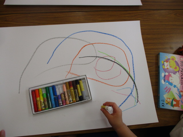 白い画用紙にお絵かきをしました。シャーシャーと線を描いたり、顔を描いてみたり…。好きな色を使ってお絵描きを楽しみました♪
