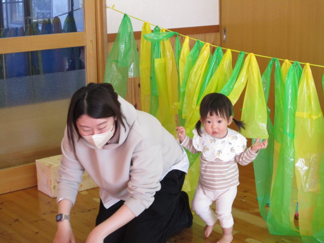 今日は動物園をテーマに、親子で一緒に運動遊びをしました。バスにのって♪や、できるかな♪の音楽に合わせて体を動かしたり、ペンギン歩きやジャンプ、はいはいなど、色々な動きに挑戦したりもしましたよ。
