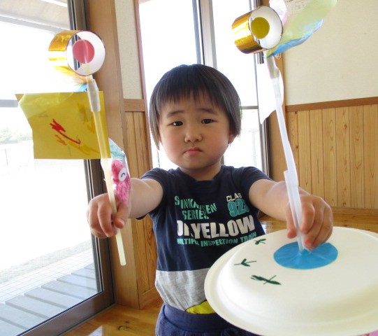 足形や花紙、水性マーカーでお絵かきをして、ミニこいのぼりを作りました。3種類のこいのぼりを作ったので工程が沢山でしたが、元気いっぱいのかわいいこいのぼりができました。