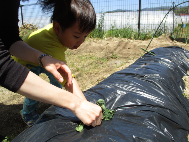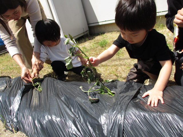 あわせて、児童館裏の畑でさつまいもの苗植えもしました。畑ではカタツムリとの出会いもあり、それもまた楽しかったようです。秋の収穫が楽しみです♪
