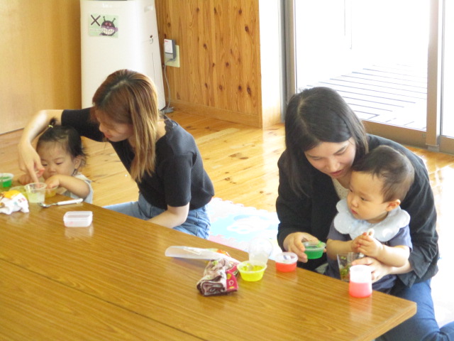 寒天あそびをしました。4色の寒天を手で触ったりスプーンですくったりなど、それぞれの遊び方で感触を楽しんでいました。寒天に触ることがはじめてのお子さんもいましたが、少しずつ慣れて、最後はダイナミックに、そして笑顔いっぱいで遊んでいました♪