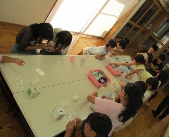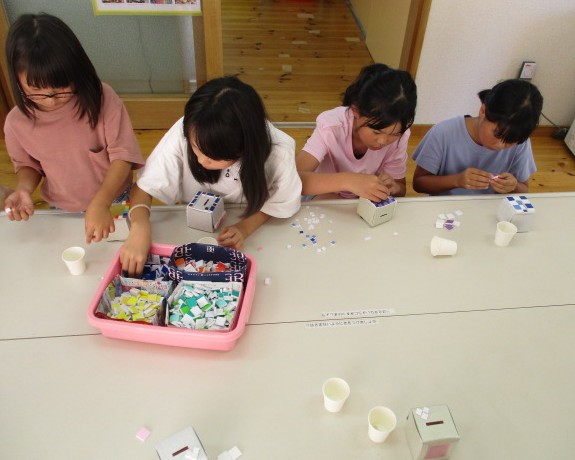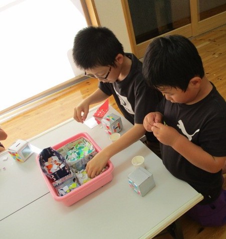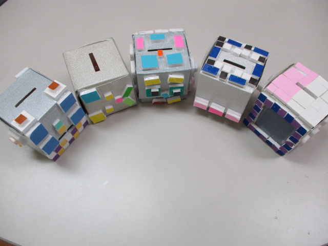 牛乳パックと手作りのタイルシールを使って貯金箱作りをしました。