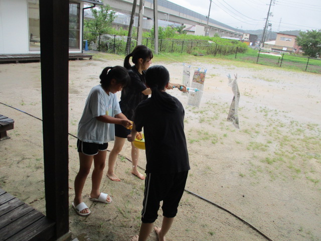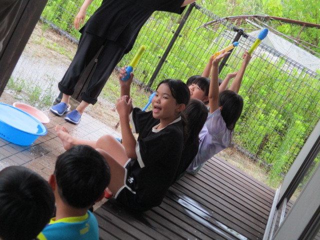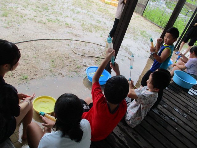屋根の下や雨の止み間を見ながら、水鉄砲遊びをしました。久しぶりの戸外遊びに子どもたちは大はしゃぎ♪少しの時間でしたが、しっかり楽しむことができました。